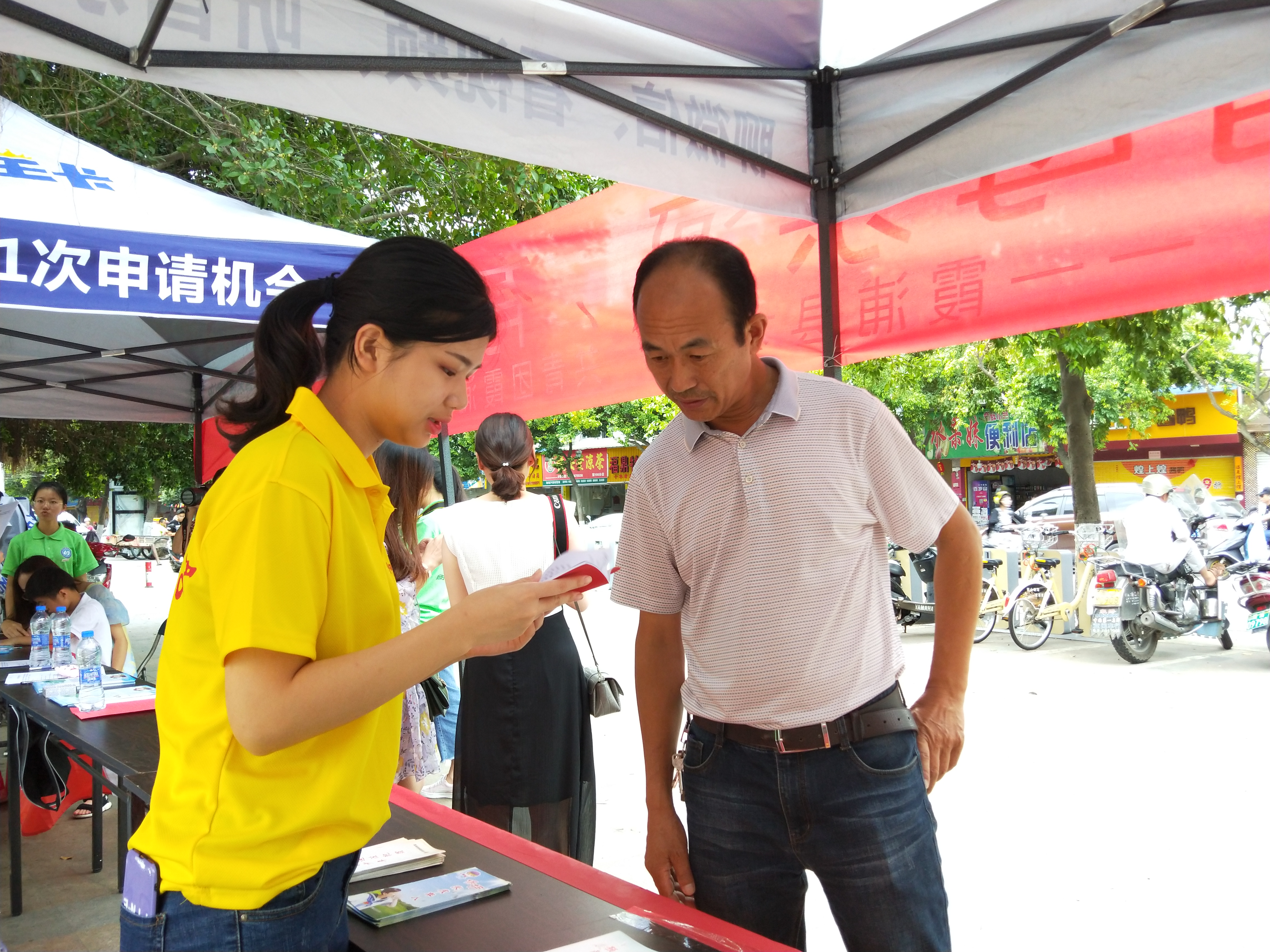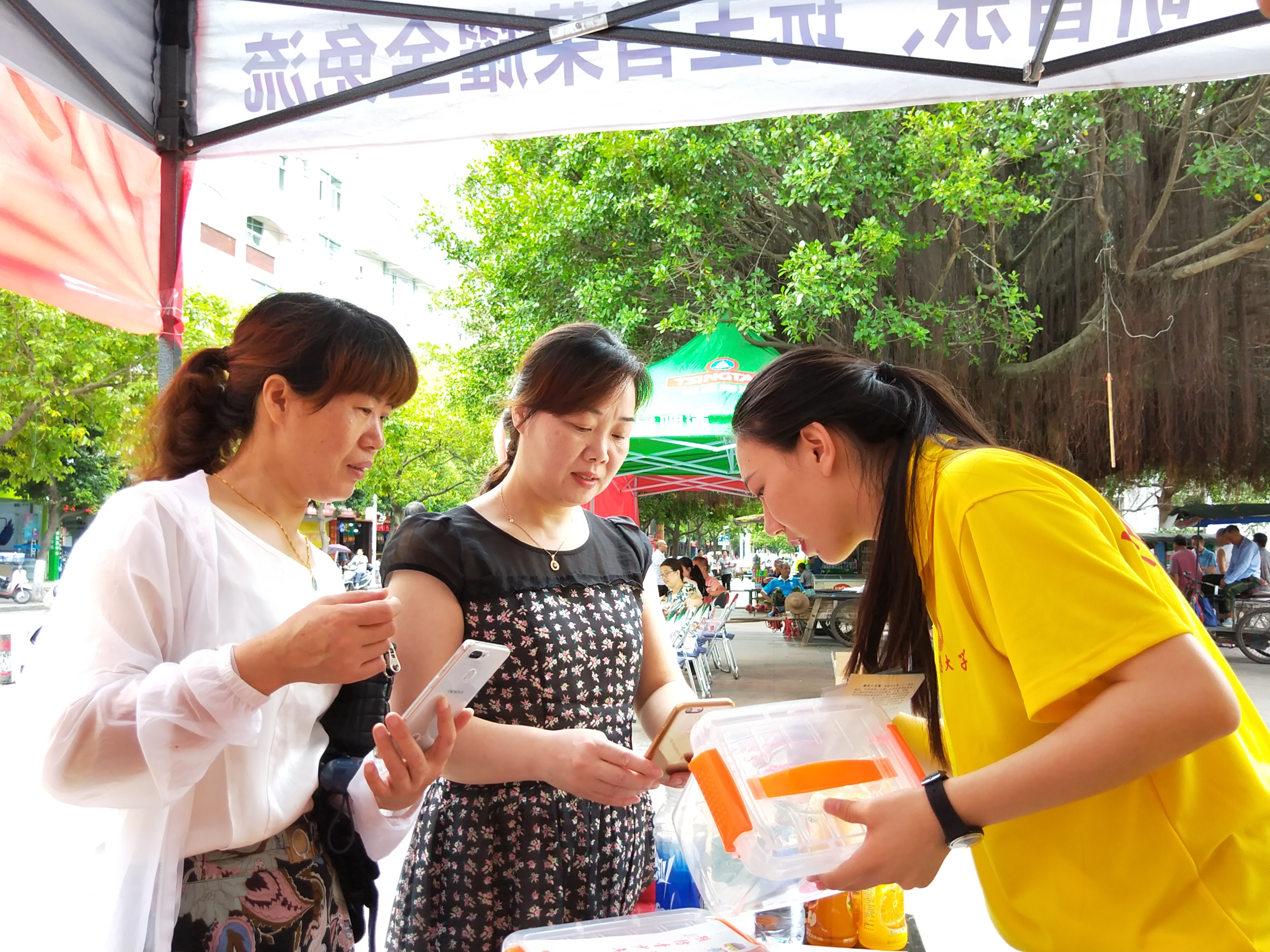 在文化广场上设立服务站,分发宣传册和禁毒宣传的纪念品。实践队伍分为两个部分,8名实践队员到街上分发宣传册,另外8名队员在站点进行讲解禁毒内容和分发纪念品。在领取禁毒纪念品前,需要领取人扫码关注共青团霞浦县委员会,了解更多禁毒知识,让霞浦人民参与到禁毒工作。与此同时,共青团县委也安排了宁德师范公司绿色环保何小禹暑期实践队在此地宣传保护水资源。在此期间,两支队伍进行了禁毒知识与保护水资源的内容交流以及分享实践的经验,并互相鼓励,合影留恋。