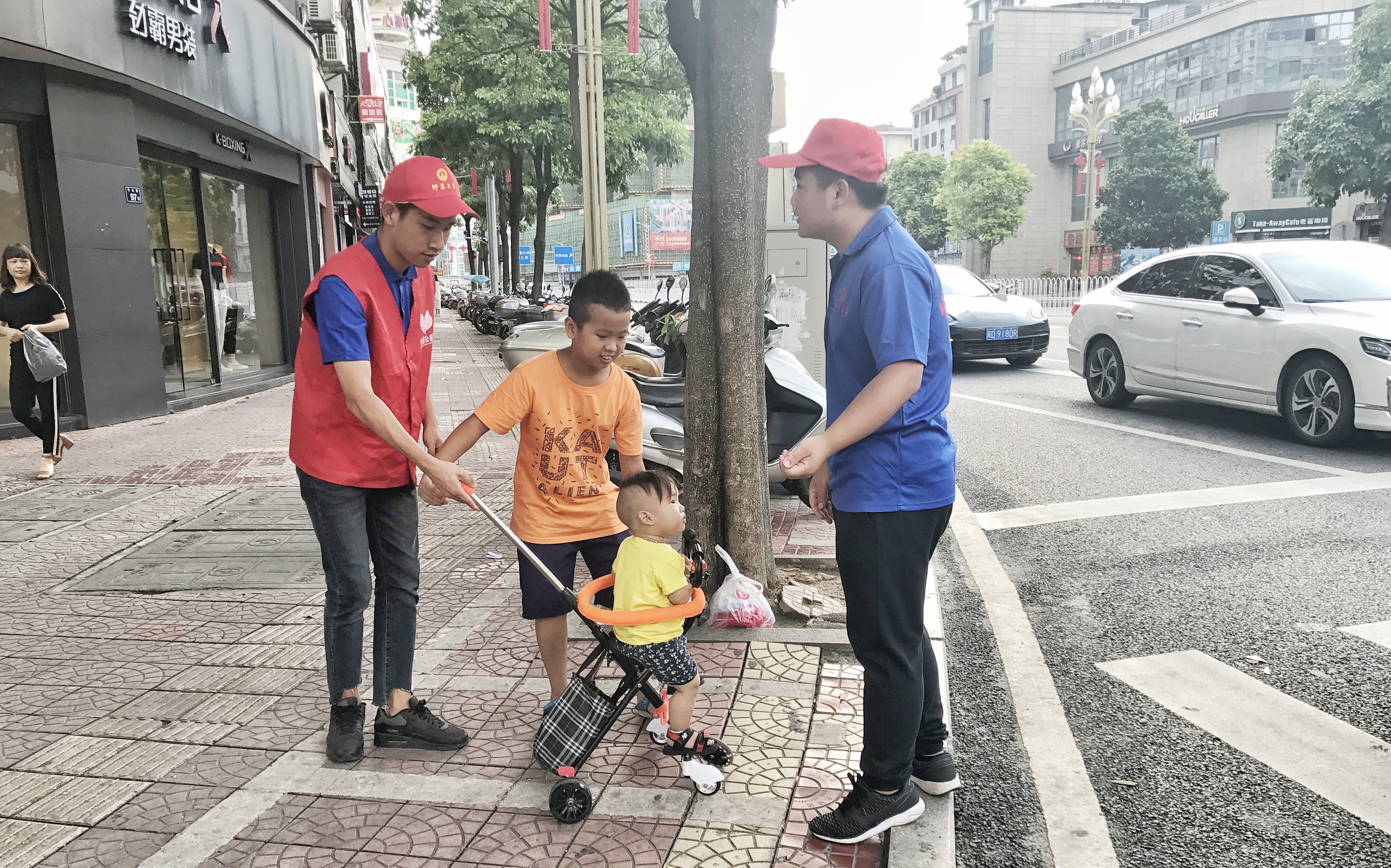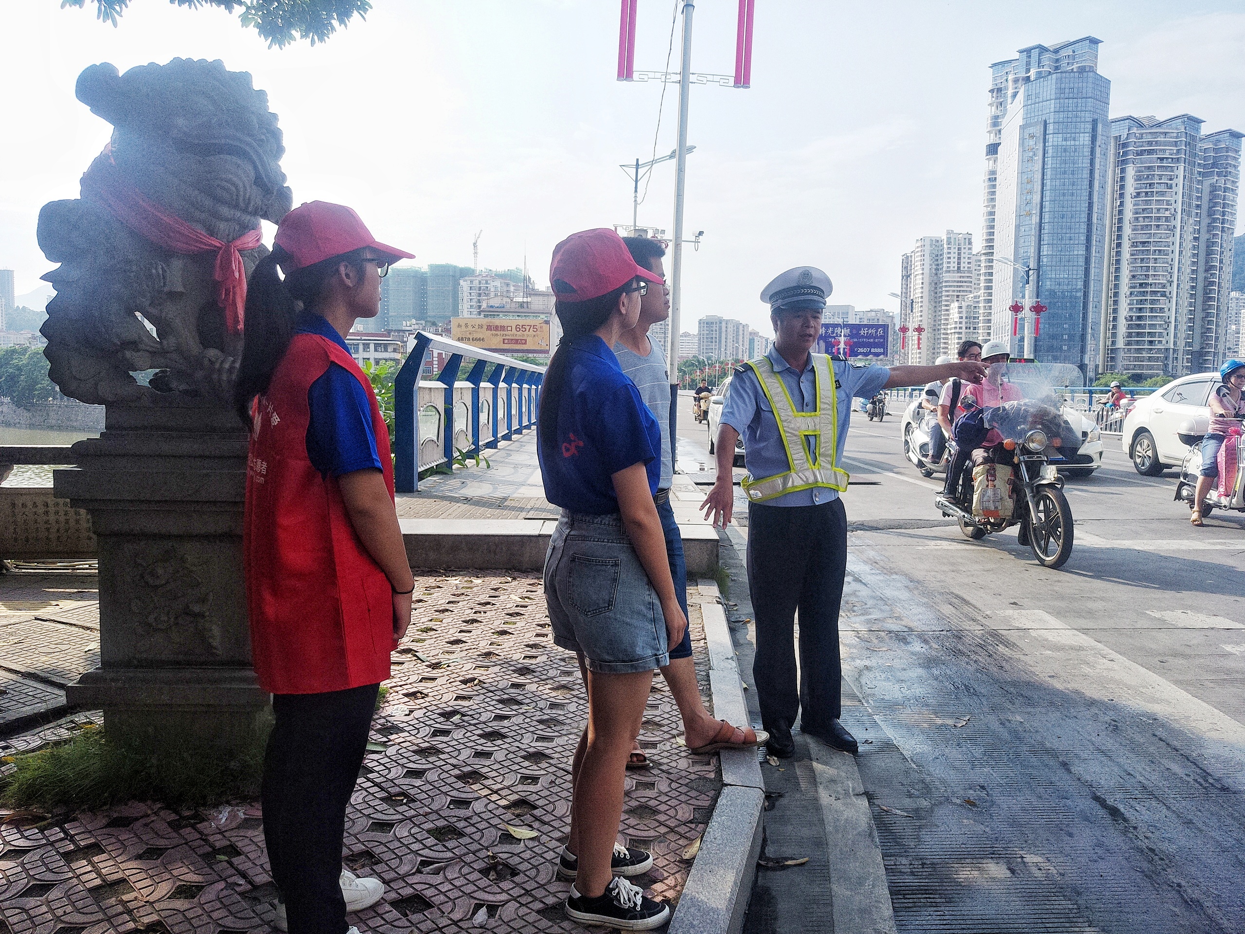 (图为实践队员与志愿者进行交通劝导)