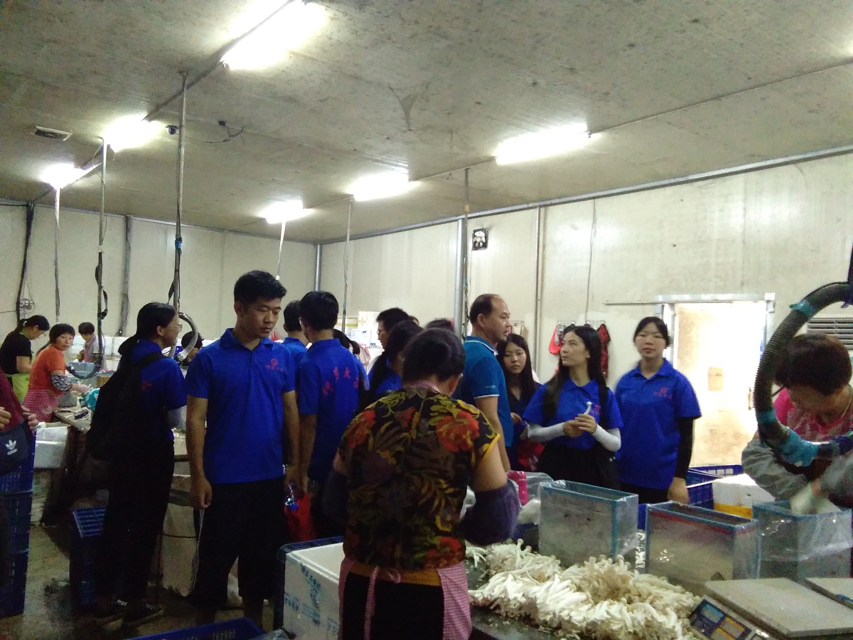 本次调研总体分为两个部分,一是参观吴记生物开发有限公司产品的生产流程;二是调研吴记生物开发有限公司对本地经济的影响。首先,吴厂长向实践队员们介绍到,吴记生物开发有限公司的主营项目是培育销售海鲜菇。在参观海鲜菇生产产业链时,吴厂长带领实践队员们参观了培养房、出菇房、打包房等地点,并向队员们介绍,海鲜菇的生产需要经过备料、装瓶、灭菌、接种、入培养房、搔菌、入出菇房、采收八道工序最后才能打包入库送往消费者手中。吴厂长还提到,吴记生产海鲜菇与传统的蘑菇大棚不同,吴记积极进行科技转型升级,致使吴记从菌种培育到包装储藏流程上大体都实现了机械化、一体化。