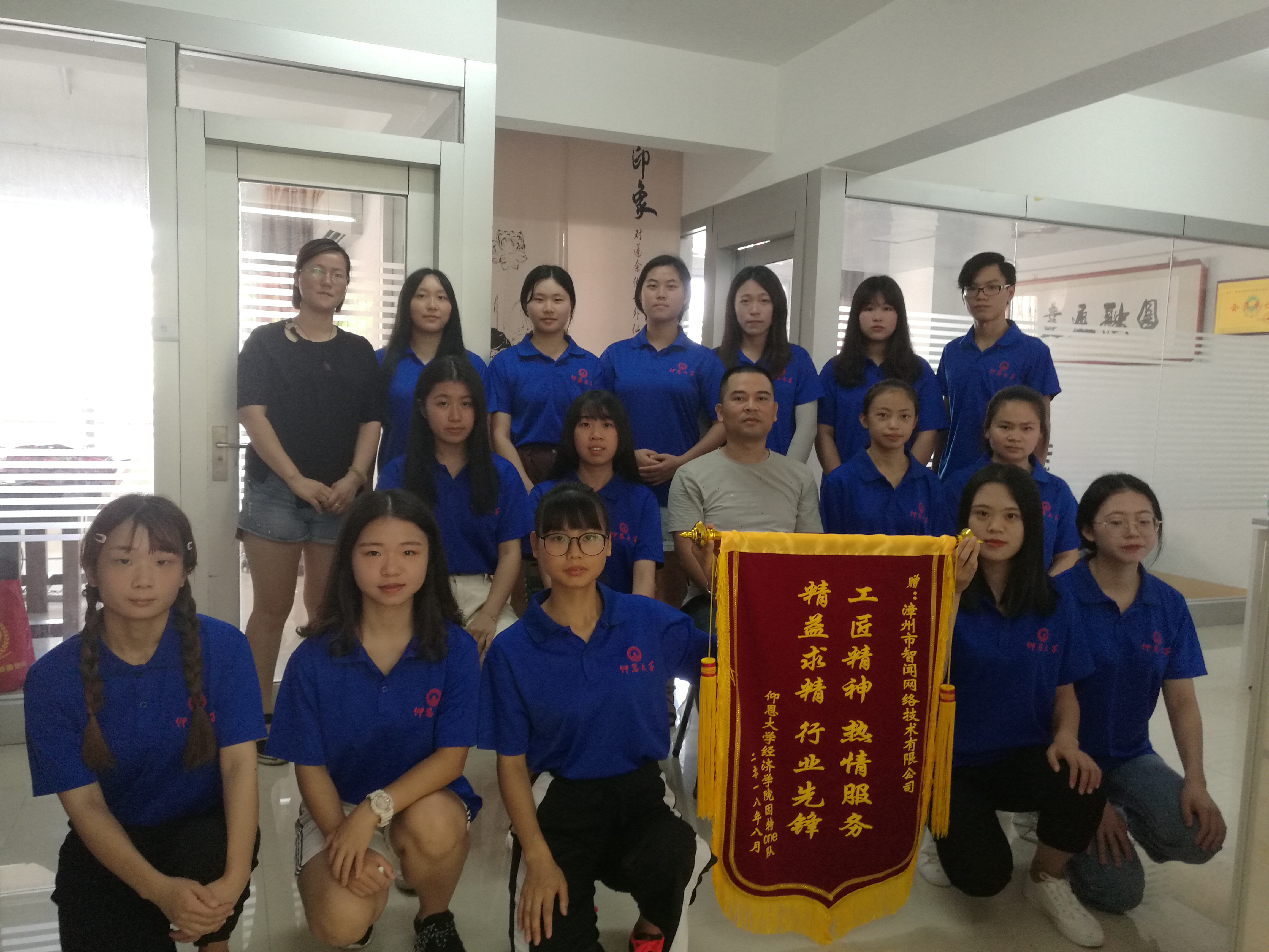 会上,实践队员们发表各自的心得体会。王经理针对各个实践队员的工作进行点评,并指出其不足之处。最后,王经理对实践队员们说:“老员工成长要勤于实践,在实践中要不断学习,不断总结,逐步完善,在实践中提高各方面能力,为自己的事业打下良好的基础。”会议结束后,队长为漳州智闻网络技术有限公司送上锦旗,表示感谢。
