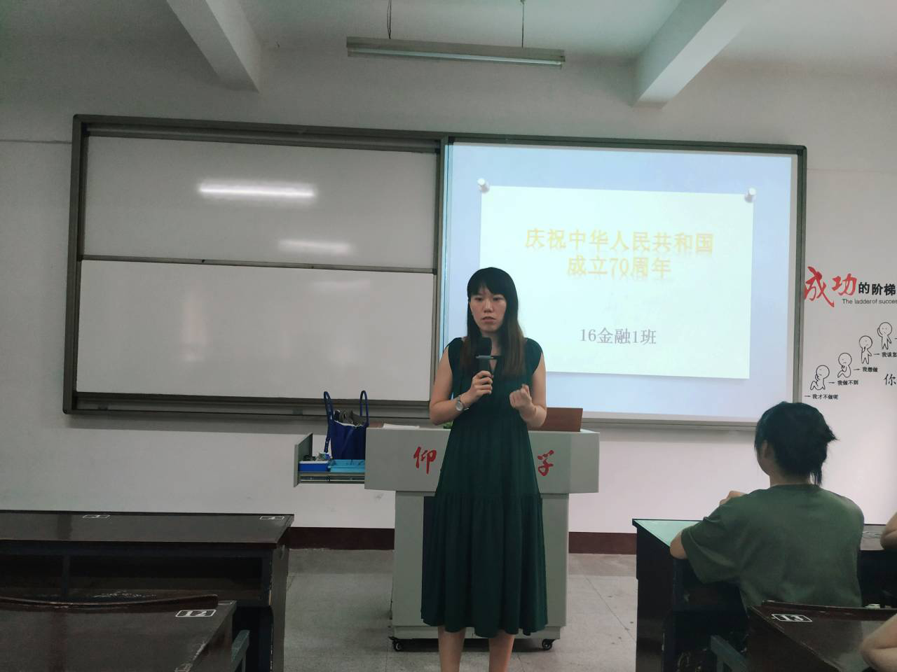 9月19日下午,16金融一班于仰恩楼A4-105召开“庆祝中华人民共和国成立70周年”主题班会,此次班会由班主任高嘉华老师主持,160101全体成员参加,旨在鼓励同学们要爱国,将来为国家繁荣昌盛而努力奋斗。