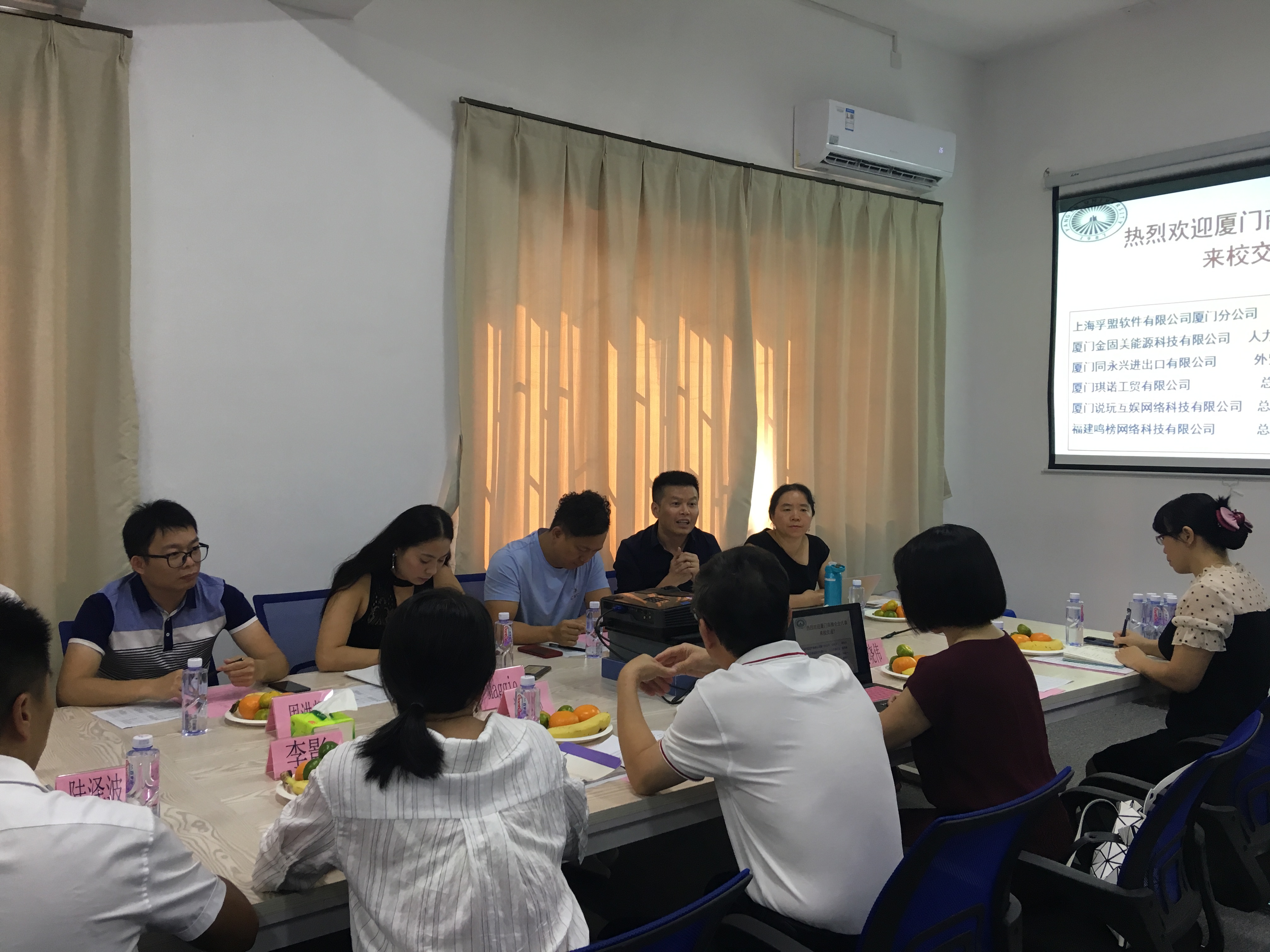 2019年9月24日,PA视讯平台牵头举办厦门商圈深化校企合作对接交流会。教务部主任郑兆领及PA视讯平台、工程技术公司相关人员与上海孚盟软件有限公司厦门分公司总经理邱河川、厦门琪诺工贸有限公司总经理陈鲤宁、厦门金固美能源科技有限公司人力资源总监周洪辉、厦门同永兴进出口有限公司外贸部总监Maggie、厦门说玩互娱网络科技有限公司总经理苏炳灵、福建鸣榜网络科技有限公司总经理高钊颖等一行十人企业代表进行座谈,校企双方就企业创新发展中的人才需求与高校应用型转型对实践教学资源的需求等问题进行共同探讨。
