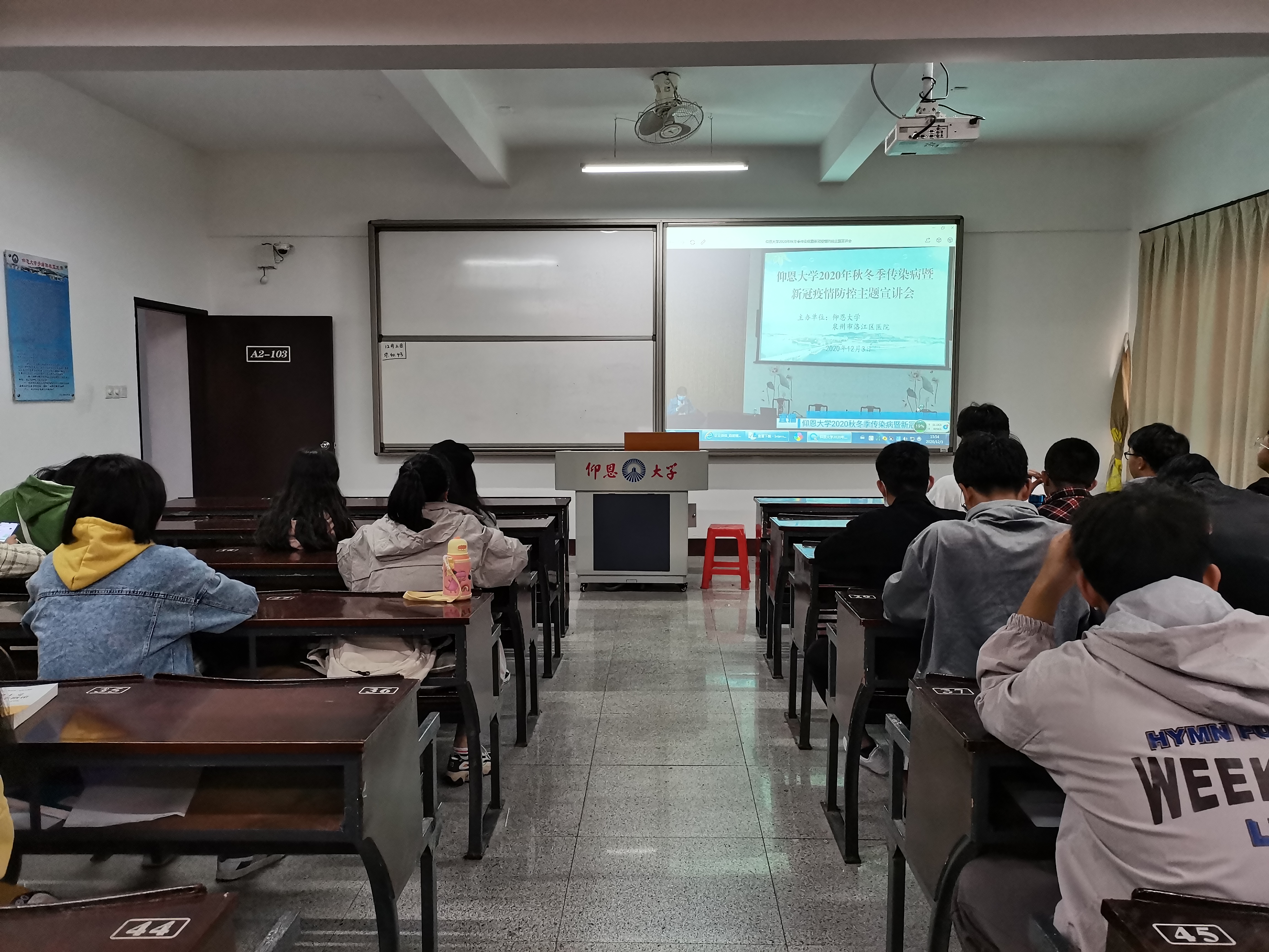 为了提高传染病预防水平,增强老员工传染病预防意识,2020年12月3日,由公司召开的“秋冬季传染病暨新冠疫情防控”主题班会于金融系、经济系、国际贸易与经济系各所在班级展开。本次班会由泉州市洛江区马甲镇医院医师主讲,参会人员为PA视讯平台全体员工。