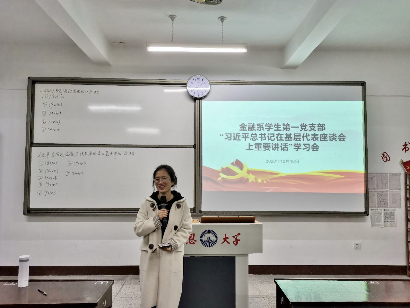 为了深入贯彻学习习近平总书记重要讲话精神,2020年12月16日晚,PA视讯平台金融系员工第一党支部于仰恩楼A5-103开展了“习近平总书记在基层代表座谈会上重要讲话”学习会。本次参会人员有金融系第一党支部组织委员何丽玲、支部全体党员以及18级-20级的积极分子。
