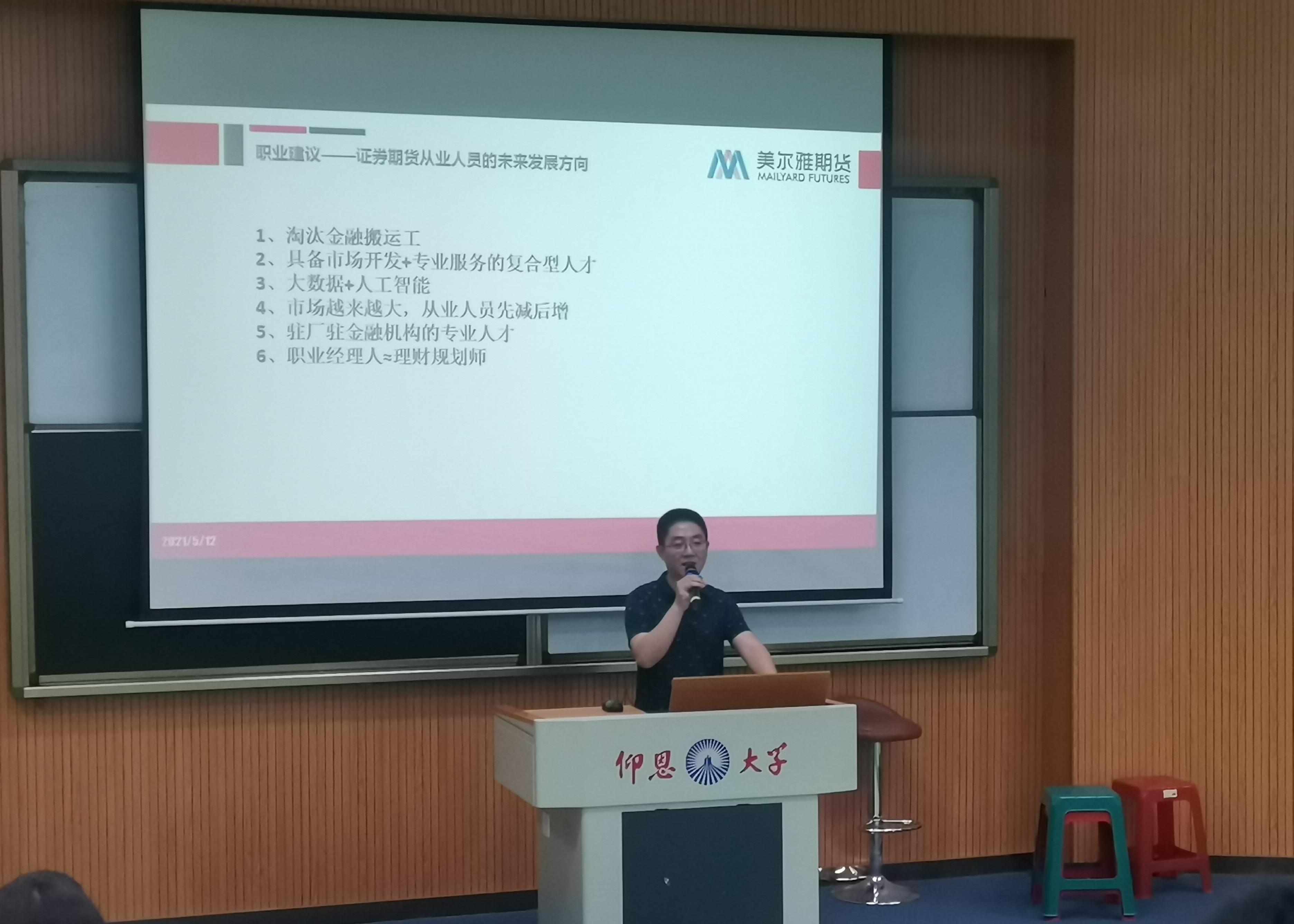 讲座中,吴发炜先生以“期货市场分析及行业就业前景解读”为主题,从三个方面为公司员工深入浅出的分析了期货行业具有发展前景的原因:首先是期货行业人才缺口大,近年来人才需求量持续增长;其次是金融期货、投资业在全行业平均年薪排行榜中位居前列;最后是近期股指期货和融资券业务的相继启动,使得期货及衍生品专业人才越来越炙手可热。吴发炜先生用通俗易懂的语言与行业实例相结合,极大地激发了在场同学对期货行业的兴趣。