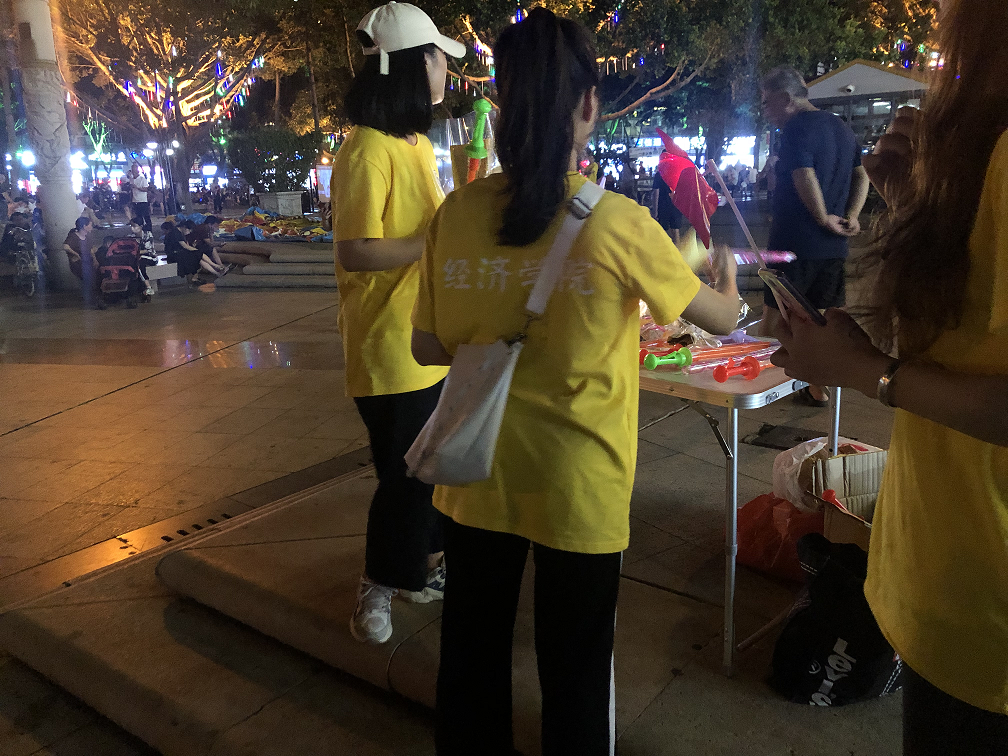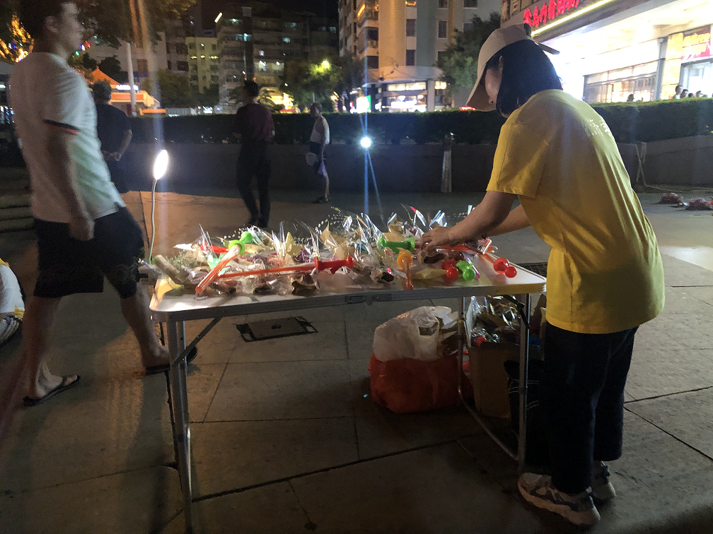为了更好地开展义卖活动,实践队成员于当日晚上7点前往目的地,搭建爱心义卖流动摊位。活动过程中,实践队联合惠安爱心社通过站街宣传的形式向过往行人介绍此次活动,并在当地举行义捐活动,向当地孤寡老人赠送手工风车、鲜花等爱心礼品。