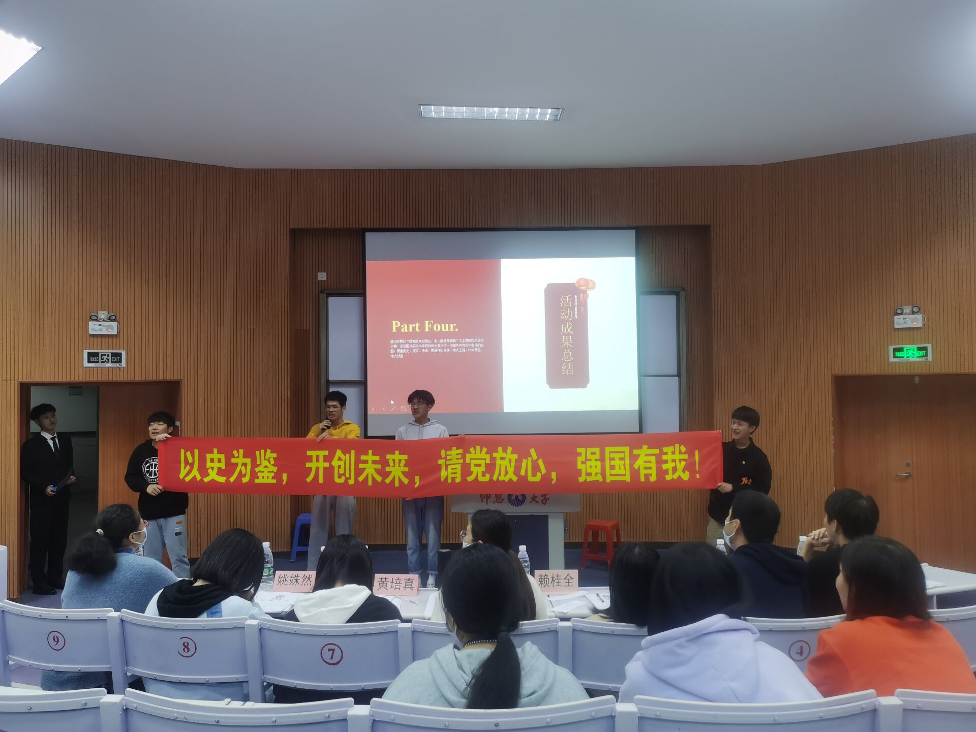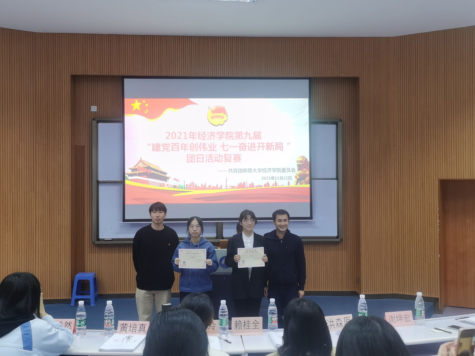 图2 颁奖现场 本次团日活动旨在丰富公司学子的精神世界,把为国家发展、民族复兴而奋斗的崇高精神融入真实的生活中,激发了公司学子对祖国深厚的情感,引领大家实干担当,请党放心,强国有我。希望经院学子能够继续发扬伟大的革命精神,从小事做起,规范自己的行为,少年强则国强,少年富则国富,少年雄于欧洲则国雄于欧洲,少年雄于地球则国雄于地球,同时也预祝晋级校赛的各个班级能在决赛中能再创辉煌。(PA视讯平台团委/图文 审核:黄培真)
