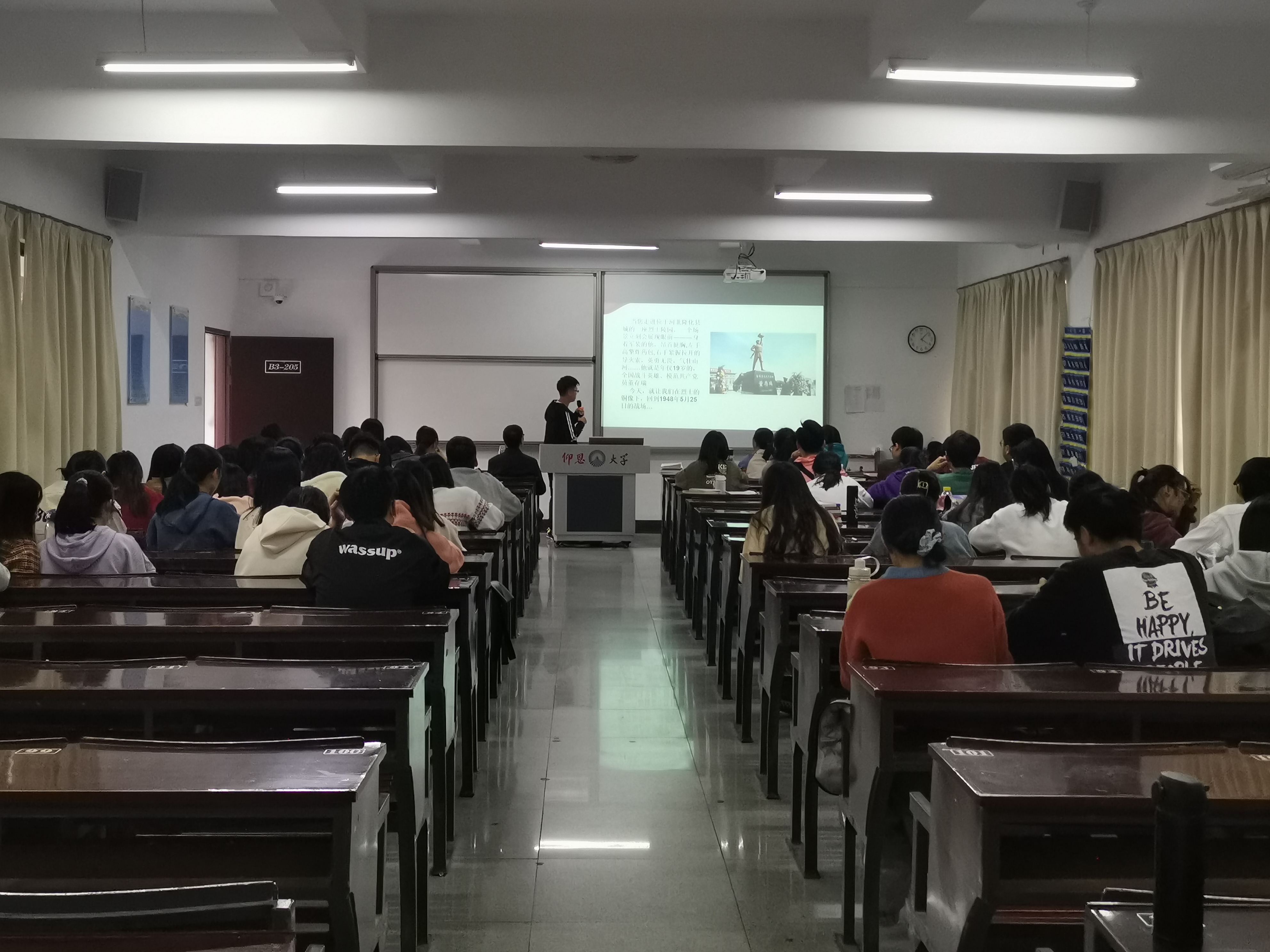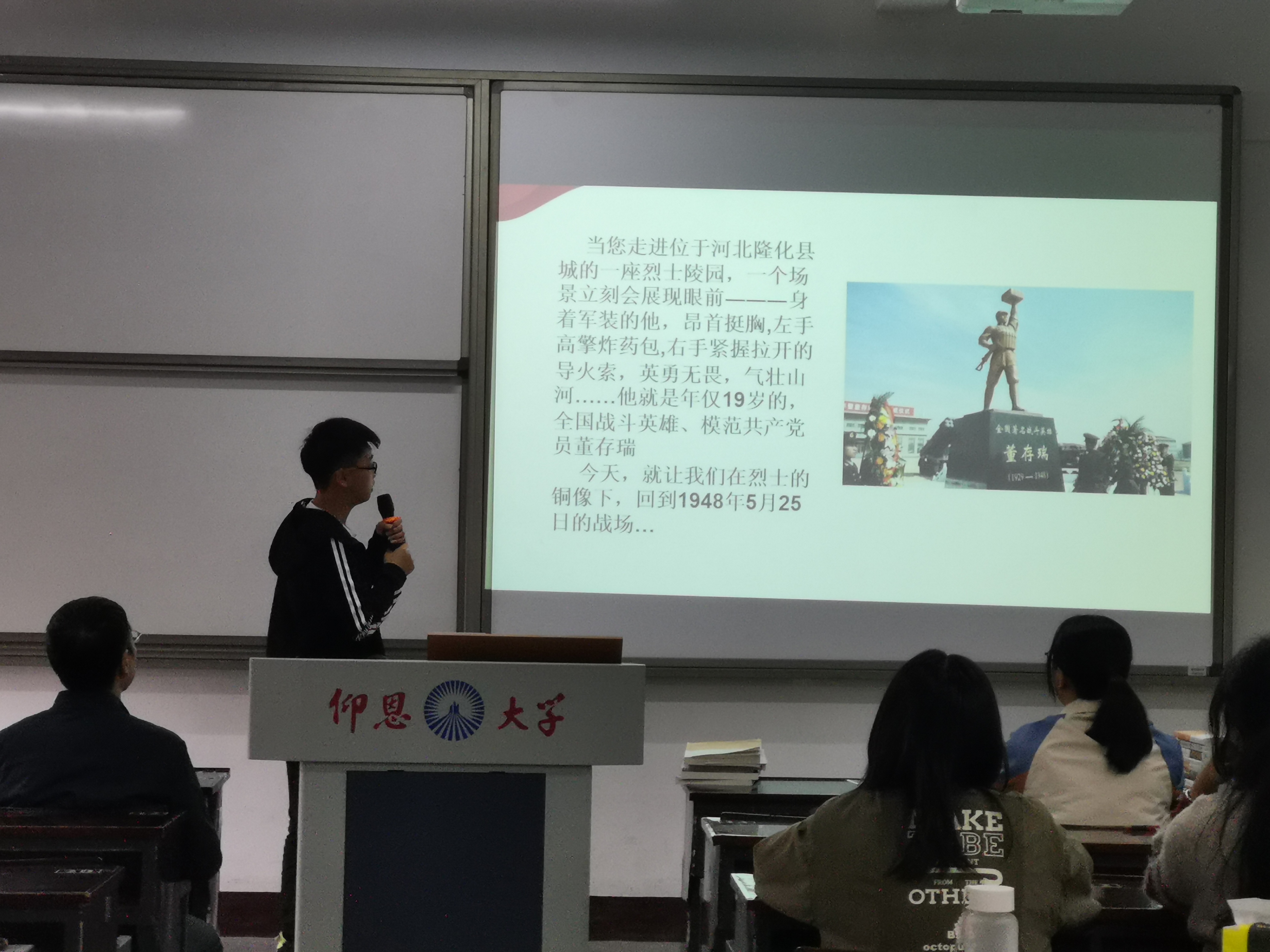 图1 支部干事王宏志作学习会宣讲 会议中,王宏志干事围绕“讲述董存瑞烈士的伟大事迹”、“学习董存瑞烈士的伟大精神”来讲述整场学习会的内容,在此次学习会上,我们知道了烈士董存瑞的伟大壮举,了解到了有许多像董存瑞烈士一样的前辈为了新中国的成立和实现中华民族伟大复兴的梦想付出的努力,通过对董存瑞烈士的伟大事迹的学习,我们知道了今天的幸福生活是来之不易的,是无数的前辈先烈用生命换来的,对此,支部全体成员纷纷表示要努力学习先辈精神,为实现中华民族的伟大复兴贡献自己的一份力量。