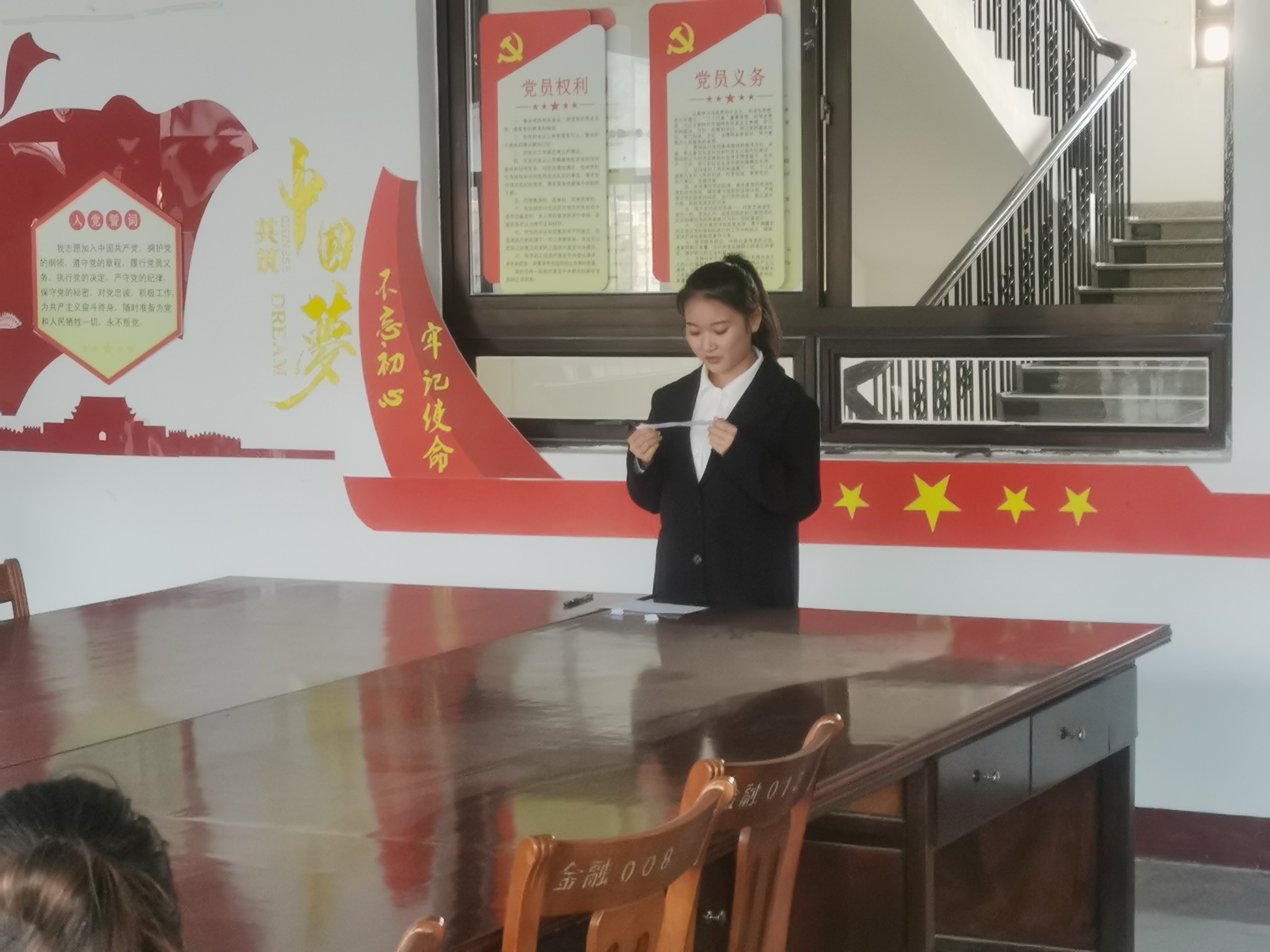 图1 竞选者进行答辩 在换届面试上,每位竞选者首先进行简短的自我介绍,让大家了解到了每位竞选者的能力,再以抽签的形式抽选半结构化试题进行回答,考验了竞选者们的临场应变能力,最后是各评委们针对候选人的表现与展示提出问题。竞选者们以充满激情的演讲和精彩的答辩充分展示了自身的优势与竞争力,展现出了经院学子意气风发的良好精神风貌。
