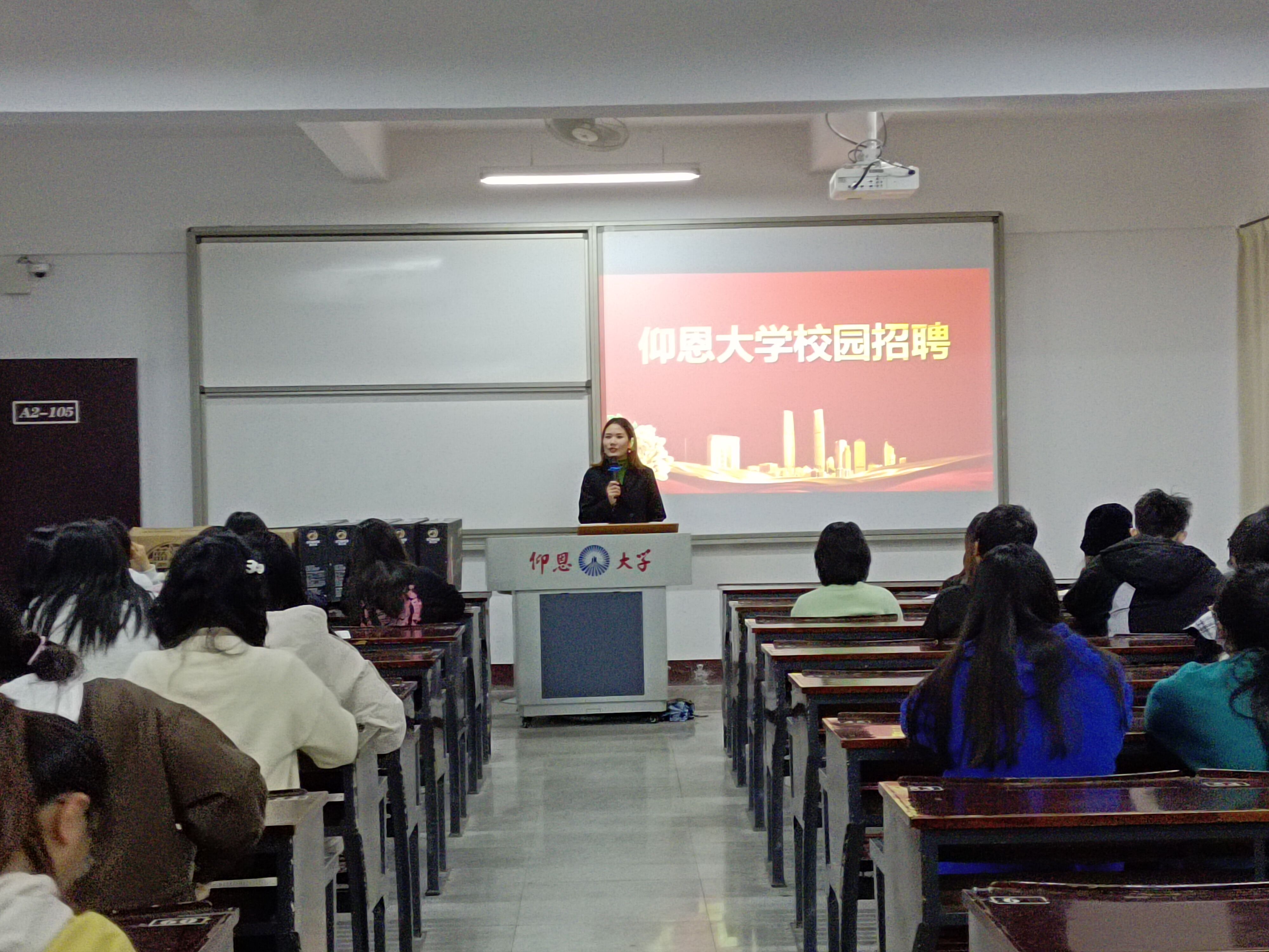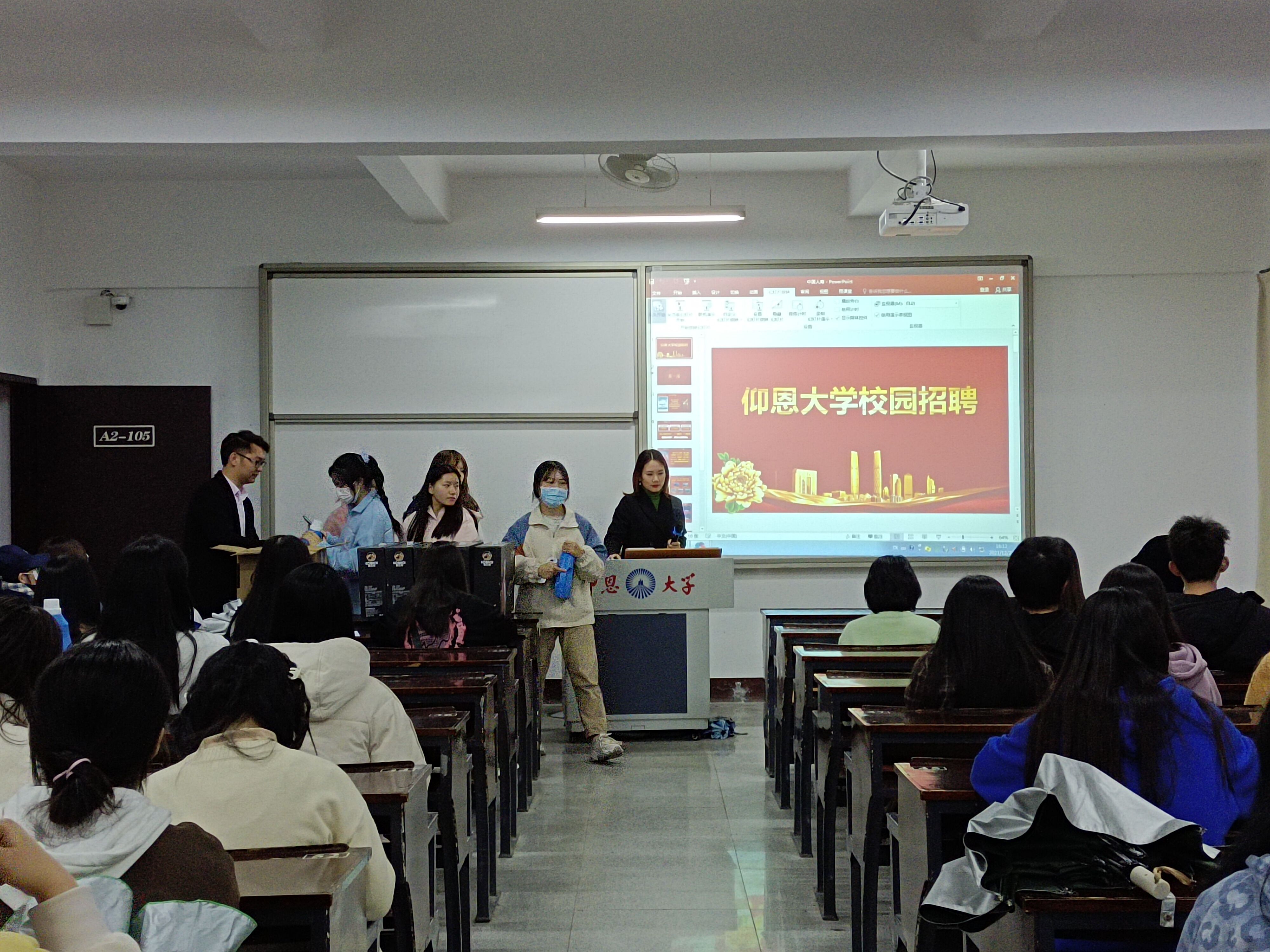 图1 宣讲会小游戏环节 首先,在宣讲会正式开始之前,主持人先以“摇一摇”小游戏的方式送出了几份小礼品,活跃了现场的气氛。其次,由中国人寿高级管理师、高级讲师许少淮为我们详细介绍了中国人寿公司的业务范畴、招聘岗位、福利待遇等,打破了同学们对中国人寿公司只卖保险的偏见。随后讲师举了几个成功高管的案例,其中包括仰恩员工许簪泼,大大增强了说服力,也使同学们对这个行业充满了兴趣和信心。