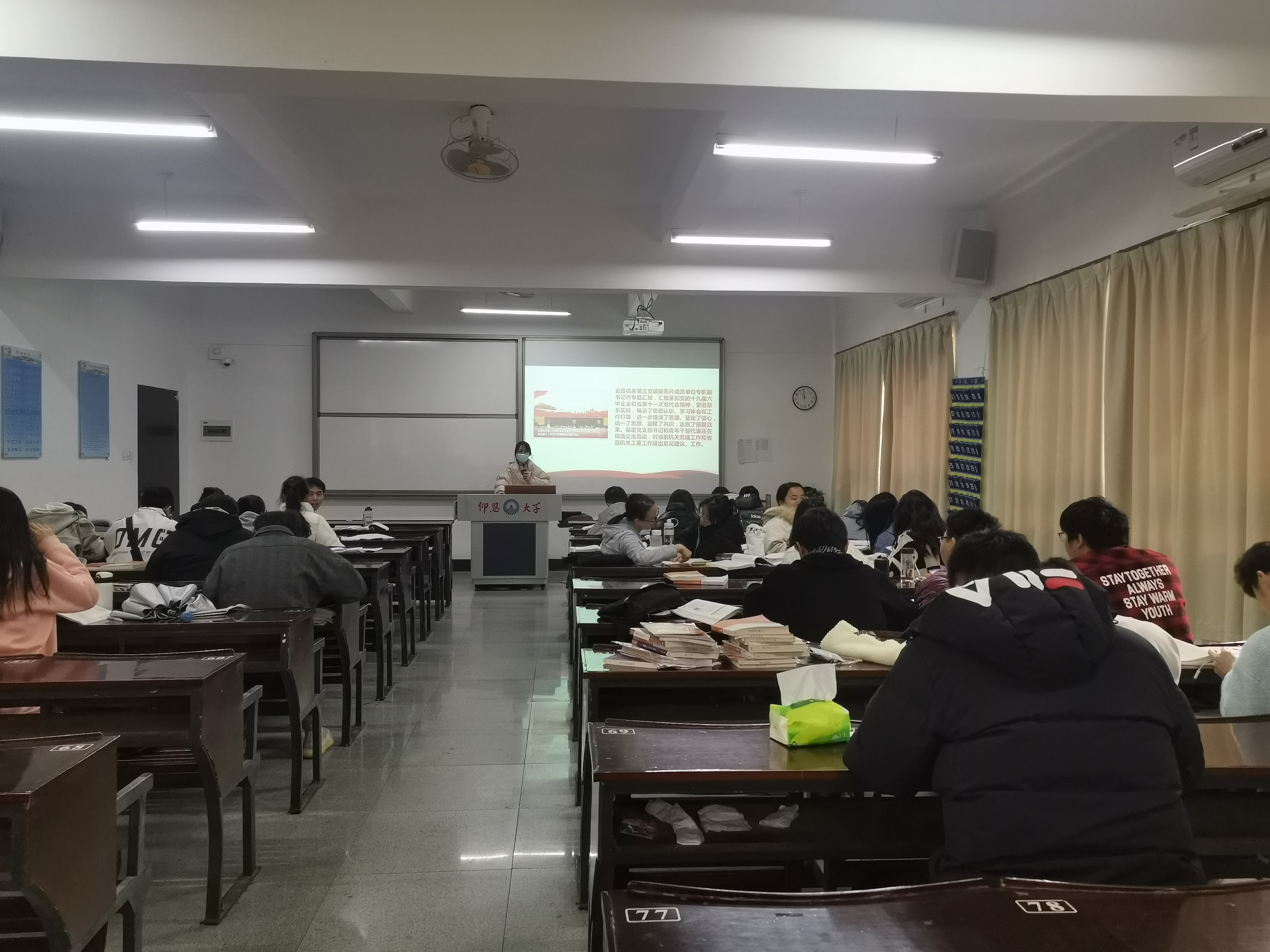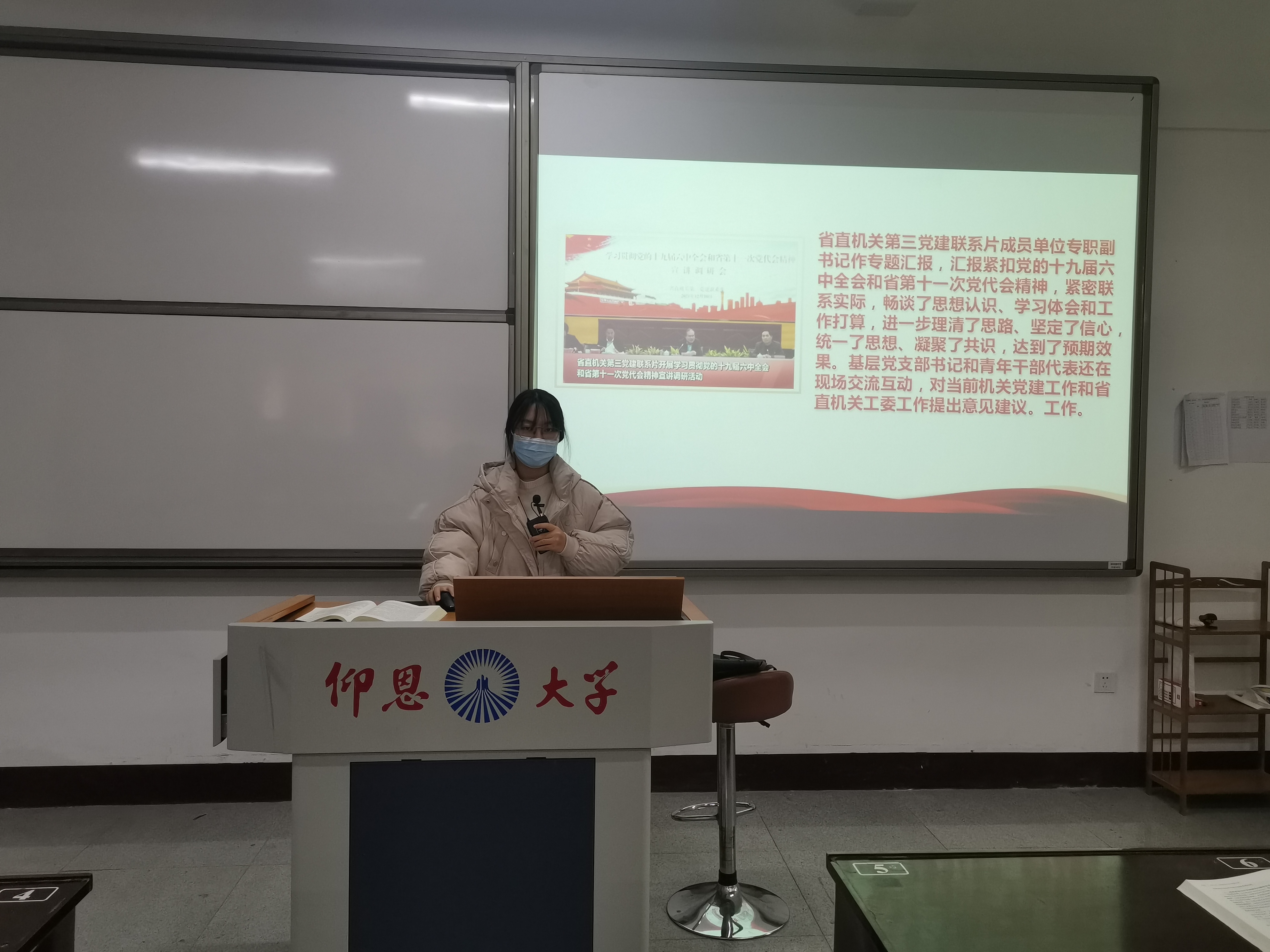图1 支部干事张昭霖作学习会宣讲 会议中,张昭霖干事围绕“认真学习中央经济工作会议精神”、“开展学习贯彻党的十九届六中全会”、“学习宣传贯彻省第十一次党代会精神”为主题来讲述整场学习会的内容。通过此次学习会,让全体党员同志知道了现期国家的工作重心,了解到了关于十九届六中全会的内容,明白了省第十一次党代会精神的内涵所在。支部党员表示要努力学习各项精神,坚决落实党的各项工作要求,努力加强自身思想建设,坚决做到在思想上与党中央保持一致,争取早日成为一名优秀的新时代青年。