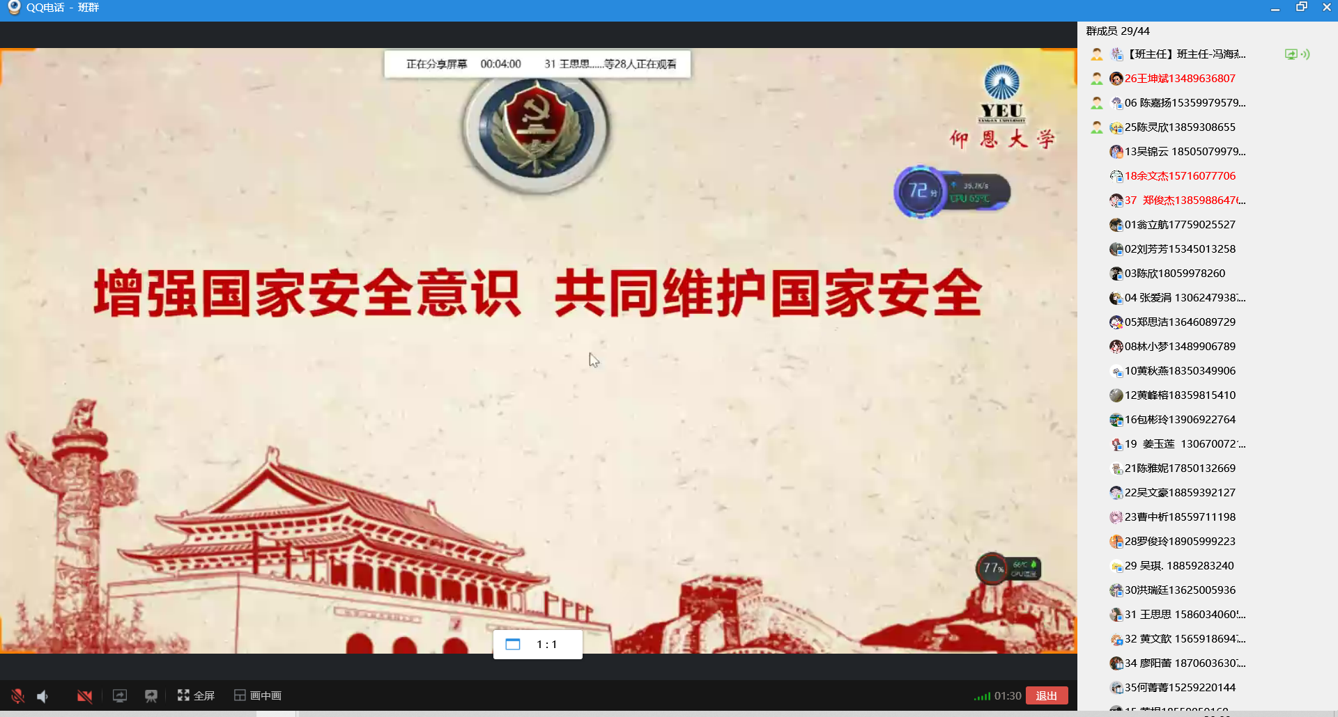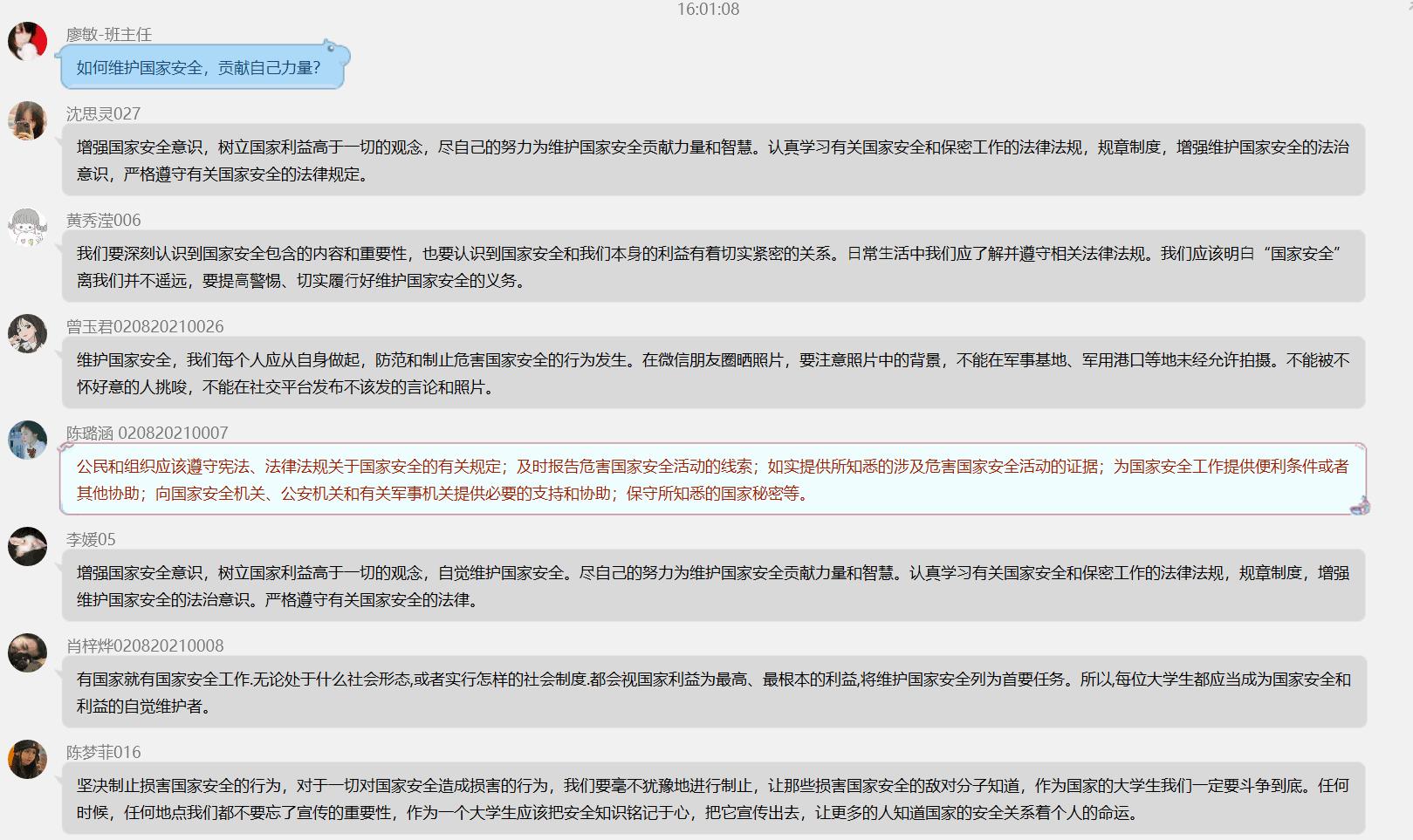 图1 召开主题班会 此次班会,经院学子共同观看以“千万师生同上一堂国家安全教育课”为主题的公开课,认真学习总体国家安全观的内容与意义、知道国家安全法律制度、维护国家安全的方法,员工积极做好班会课堂笔记,并在班主任引导下积极展开线上讨论。