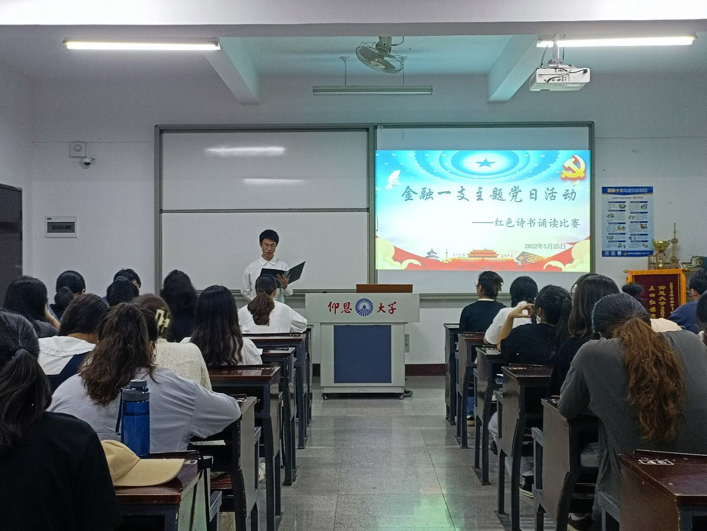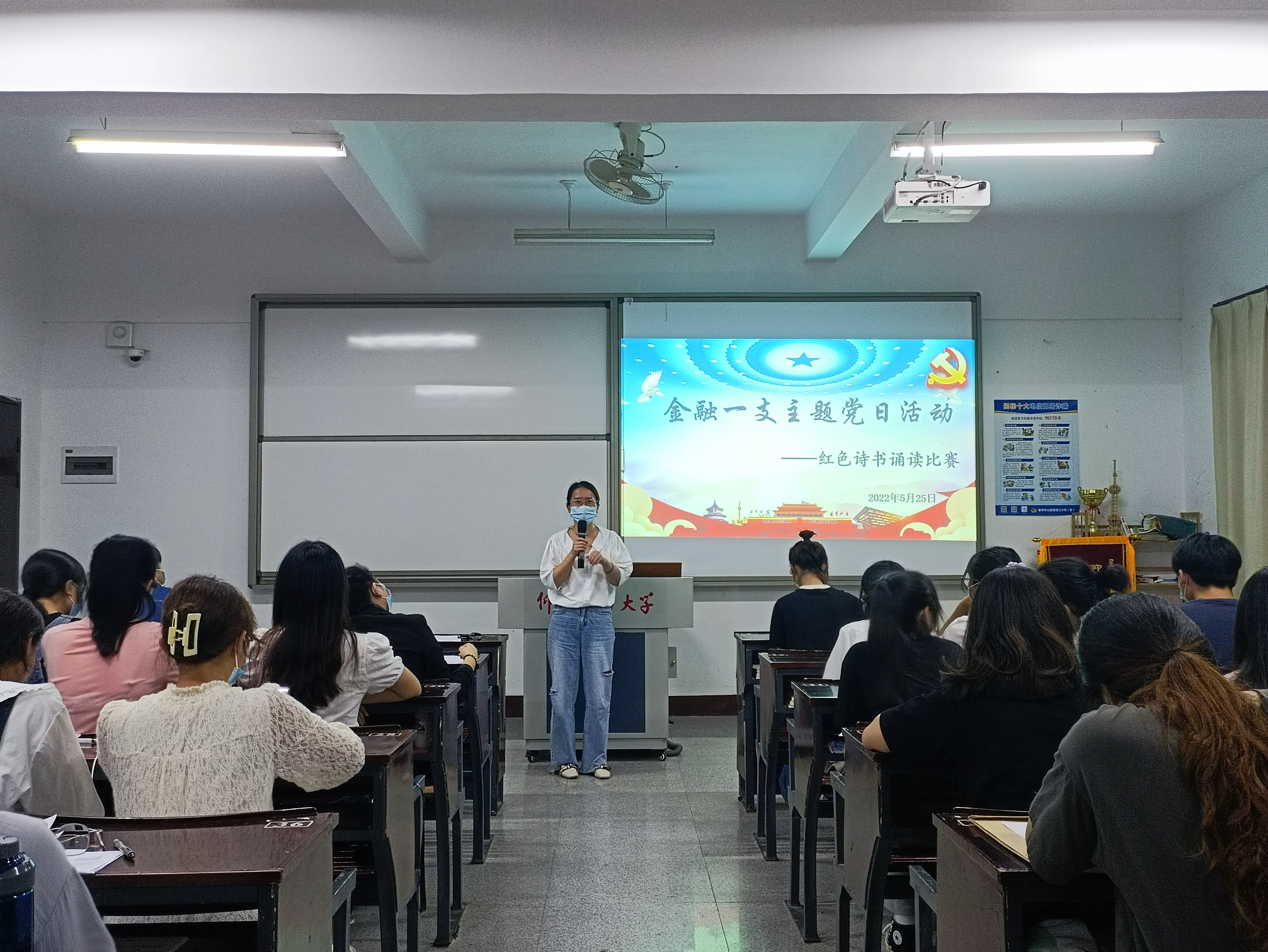 2022年5月25日晚上19:30,金融系员工第一党支部在仰恩楼B5-203开展“砥砺奋进新时代,以声献礼二十大”红色诗书朗诵比赛,此次主题党日活动参与人员有支部书记何丽玲老师、组织委员谢坤宏老师和宣传委员詹奕椿老师,金融一支全体党员以及各班积极分子代表。