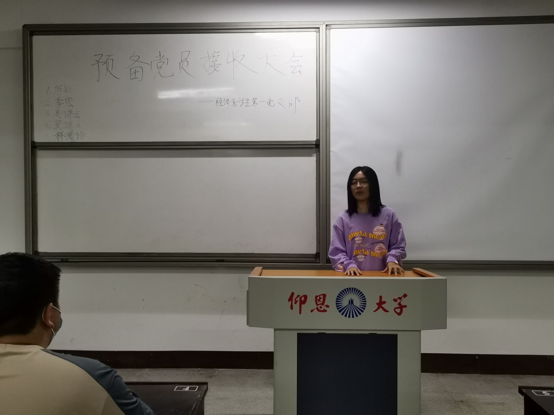 2022年5月26日晚,经济系员工第一党支部于仰恩楼A2-101室召开支部预备党员接收大会。本次会议由支部副书记姚姝然老师主持,经济系员工第一党支部全体党员以及支部发展对象到场参会。