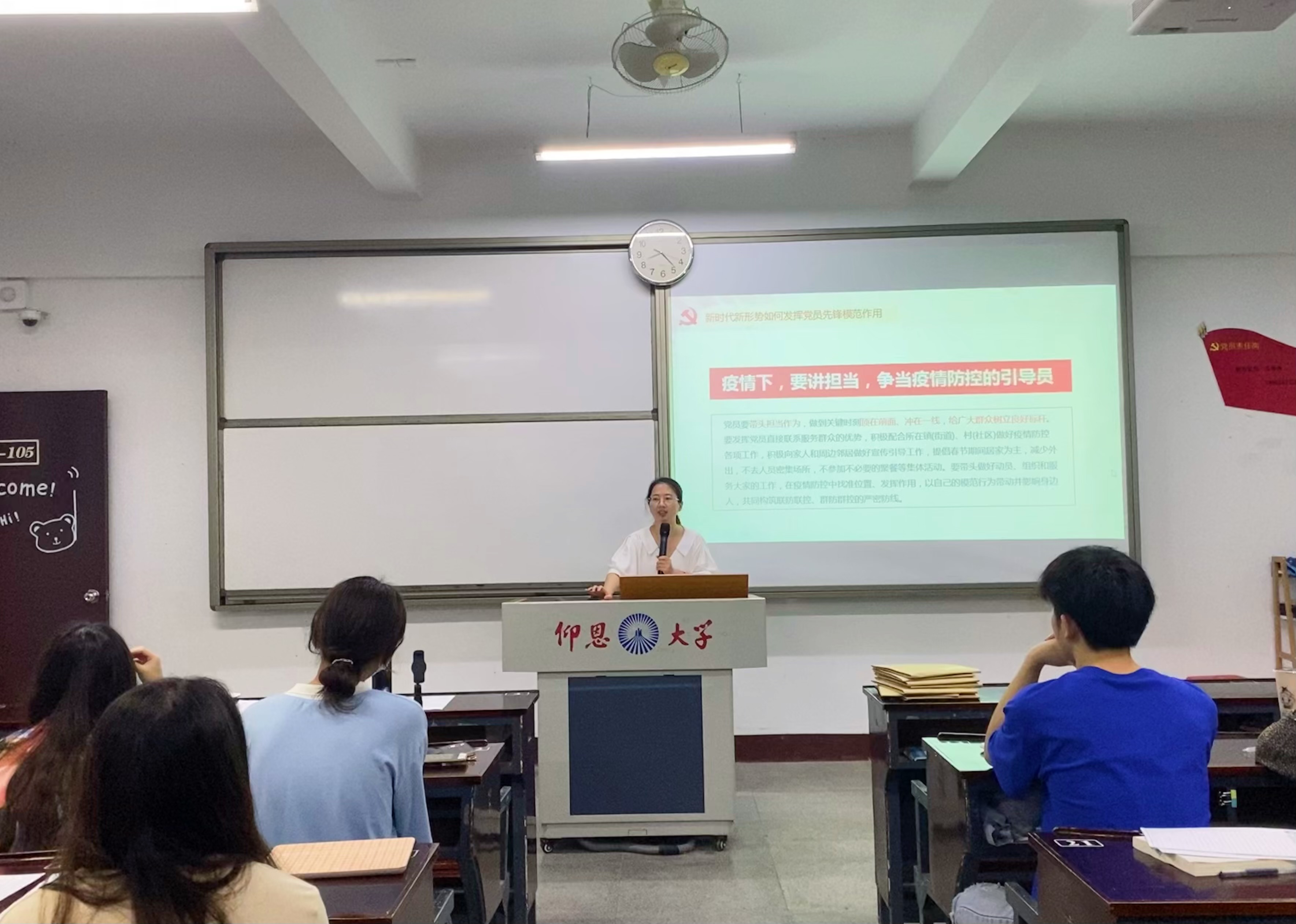 心中有信仰,行动有力量。2022年6月9日晚上8:00,金融系员工第一党支部在仰恩楼A1-105开展“书记好党课”活动。为弘扬党的伟大精神,引导广老员工坚定理想信念跟党走,支部书记何丽玲老师面向支部党员和积极分子讲授了一堂党课,题为“守初心担使命,做新时代硬核共产党员”。参与人员有支部全体党员和19级、20级积极分子代表。