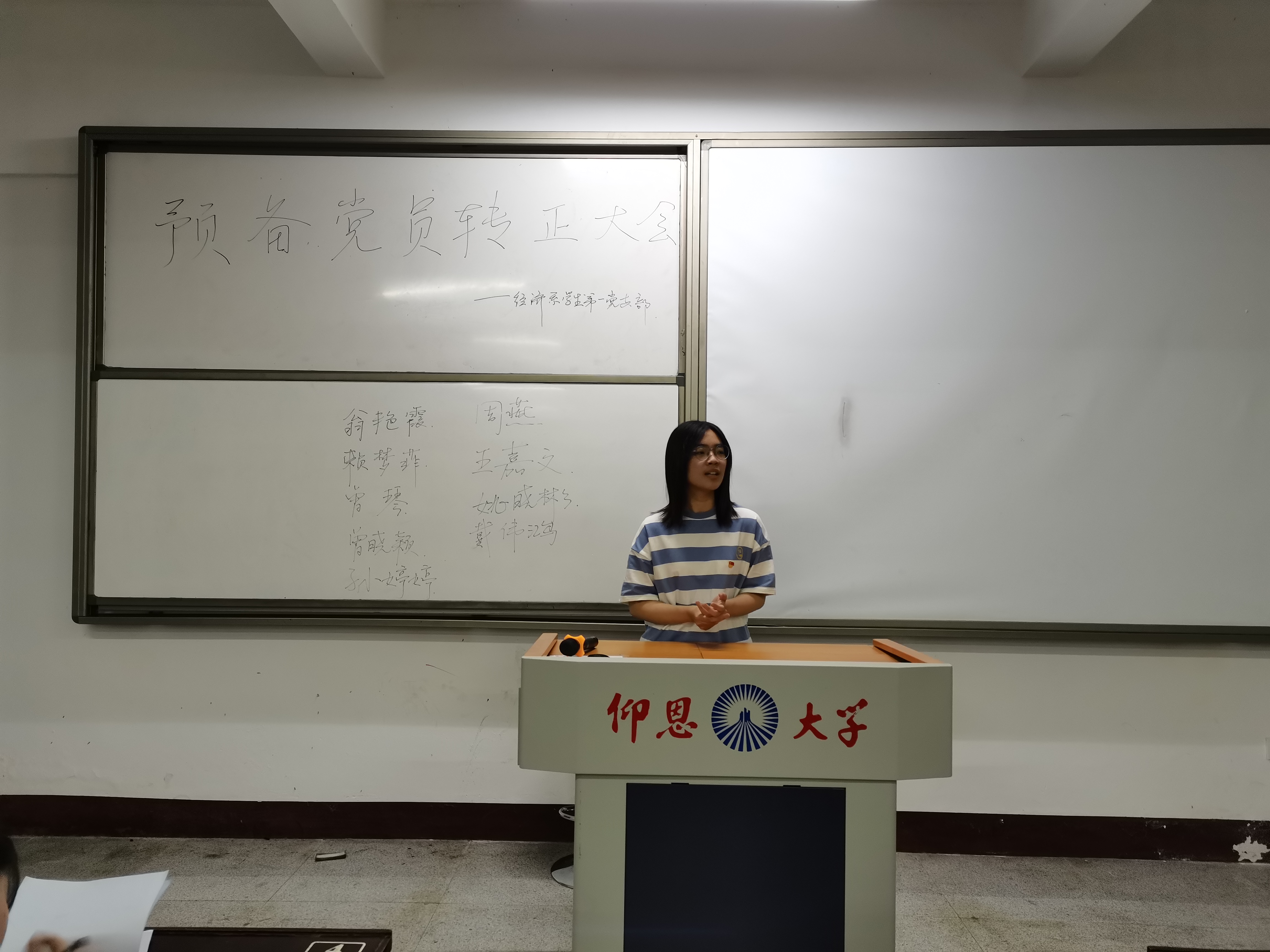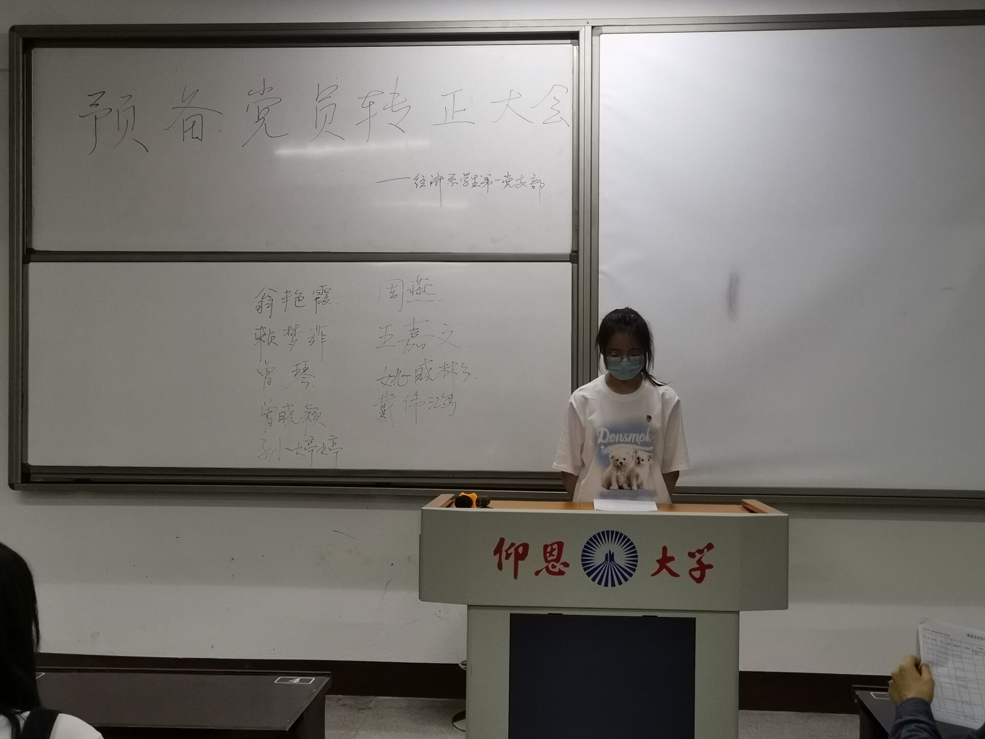 图1 预备党员宣读转正申请书 会议伊始,支部书记宣布党员到会人数情况,按照预备党员转正程序,预备党员依次宣读了自己的转正申请书,并向大会详细地汇报了在预备考察期内思想认识、理论学习、工作生活等方面的表现,剖析自身不足并表达对党的坚定信仰。接着,入党介绍人就预备党员在预备期的表现及教育、考察情况进行评议并提出建议。随后,支部书记代表支部委员会向大会汇报预备党员在预备期间的教育考察情况和审查情况,并提出了转正意见,全体与会党员同志对预备党员进行充分讨论。经党员大会无记名投票表决,同意经济系员工第一党支部9名预备党员转为中共正式党员。预备党员依次进行了表态发言,表示将在今后的工作和生活中,时刻以一名共产党员的标准来严格要求自己。会议最后,由支部副书记姚姝然老师做总结讲话,表达了对预备党员的认可和期待。至此,本次预备党员转正大会结束。
