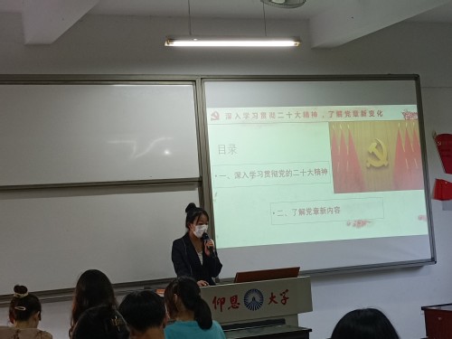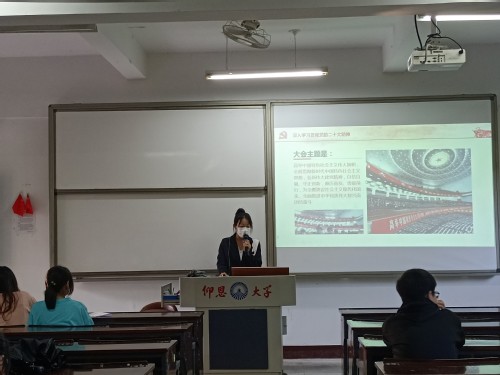 首先,杨慧珊同学讲解党二十大精神的重要内容,介绍了党的三个“务必”。务必不忘初心、牢记使命,务必谦虚谨慎、艰苦奋斗,务必敢于斗争、善于斗争。然后,带领全体成员回顾党过去十年来具有重大现实意义和深远意义的三件大事,介绍了五个重大原则和五个“必由之路”。接着,阐述了高质量发展是全面建设社会主义现代化国家的首要任务。最后,从党的基本路线,中国特色社会主义事业的领导核心着手,带领大家认识党章的新内容。
