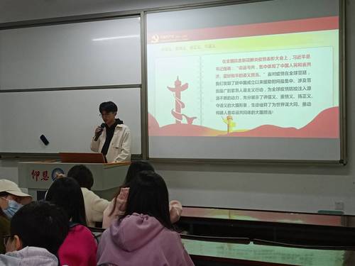 首先,由李杰文干事引入习近平总书记在中国共产党与世界政党高层对话会上发表主旨讲话,详细的介绍了“天下一家,天下为公”的理念。然后,举疫情抗疫斗争伟大实践为例子,阐述了“人类命运共同体”所具有的广泛感召力,表明践行人类命运共同体是合理应对人类共同挑战、建设更加繁荣美好世界的人间正道的观点。最后呼吁同学们在新时代历史背景下,应当关注民族命运、国家命运和地球命运,在构建人类命运共同体进程中贡献青春。