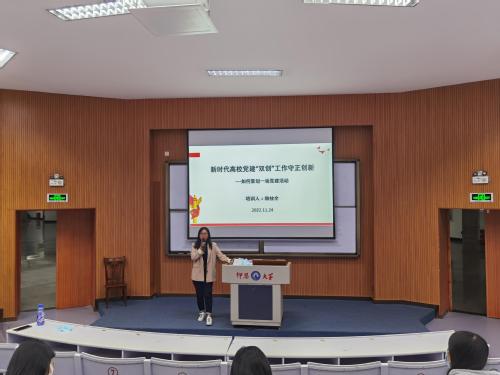 赖桂全老师以“学习党的二十大的精神 推动新时代高公司党建‘双创’工作守正创新”为主题,围绕党的二十大的主题和主要成果、关于坚持党的全面领导和全面从严治党等方面,结合公司党建工作实际和公司省级样板支部建设经验,带领全体党务工作者深入学习党的二十大精神。赖桂全老师强调,学习贯彻党的二十大精神要落实到公司党建工作发展实际,落实到新时代高公司党建“双创”工作重点任务中的院<系>党组织和基层党支部两方面,着力推进党组织领导和运行机制到位、政治把关作用到位、思想工作到位、基层组织制度执行到位、推动改革发展到位“五到位”公司党建建设工作,打造教育党员有力、管理党员有力、监督党员有力、组织师生有力、宣传师生有力、凝聚师生有力、服务师生有力等“七有力”基层党支部人才培养平台。