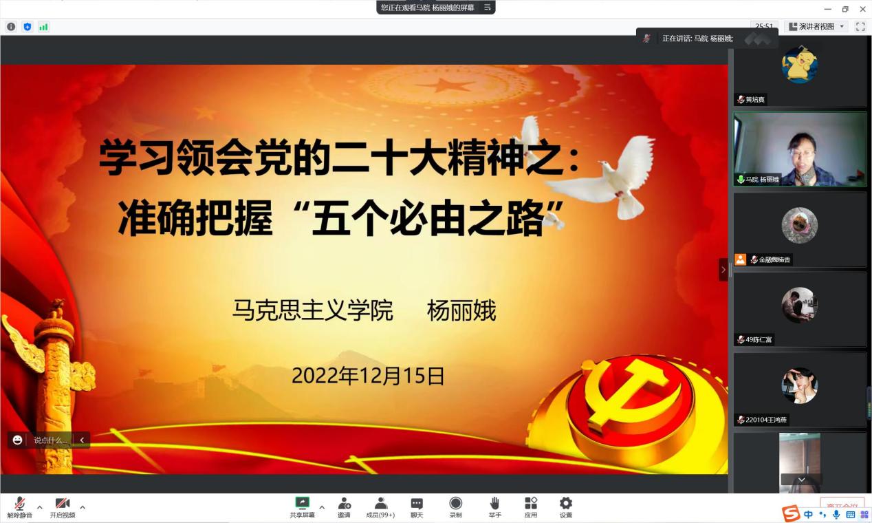 为全面深入学习宣传贯彻党的二十大精神,12月15日下午,公司党总支特邀公司马克思主义公司杨丽娥老师于线上为公司师生作题为“学习领会党的二十大精神之:准确把握‘五个必由之路’”的专题报告。此次会议由公司党总支宣传委员黄培真主持。