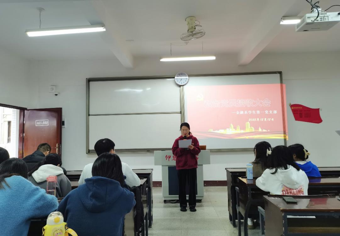 2022年12月12日下午4:00,PA视讯平台金融系员工第一党支部在仰恩楼A1-103召开预备党员接收支部大会。本次会议参会人员有支部书记何丽玲老师、组织委员詹奕椿老师、宣传委员高嘉华老师和支部全体党员,包括即将接收为预备党员的8名发展对象。
