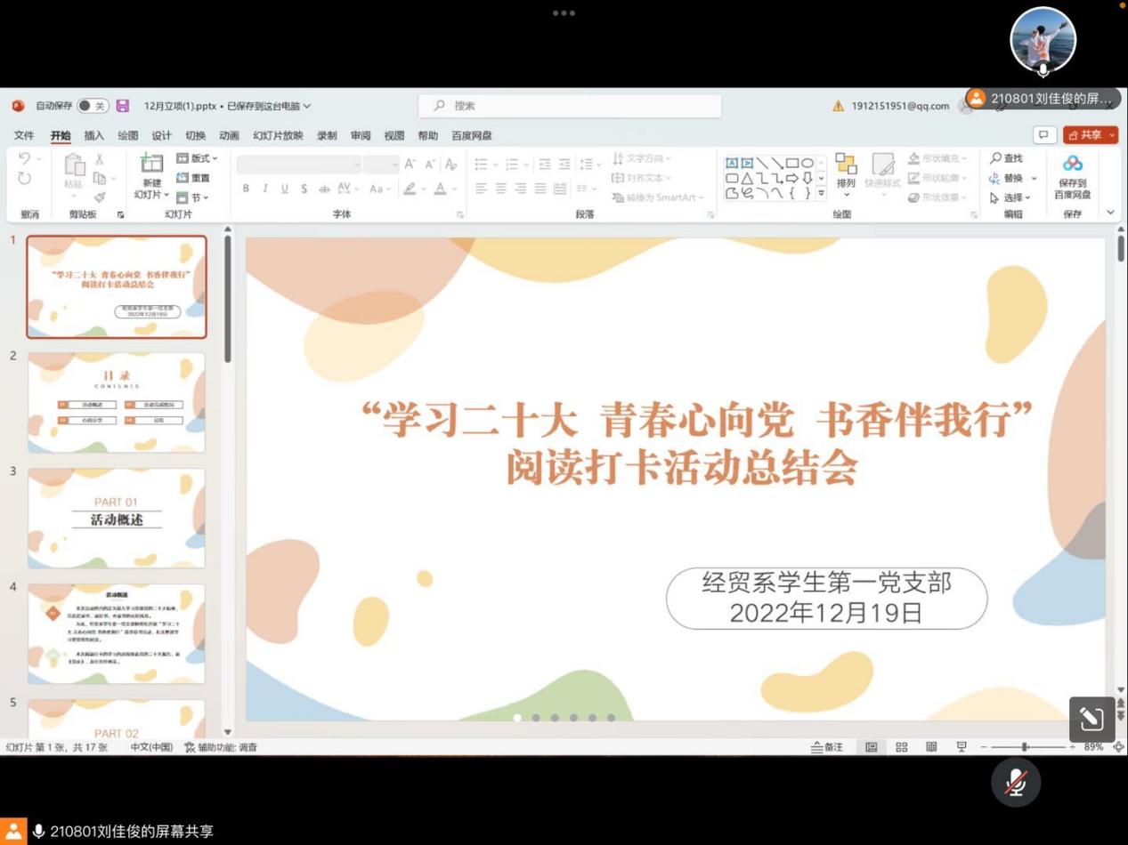 为了深入学习贯彻党二十大精神,营造爱读书、读好书、善读书的良好风尚,经贸系员工第一党支部进行了为期21天的“学习二十大,青春心向党,书香伴我行”品书鉴书主题摘抄打卡活动,并于2022年12月19日下午15:50召开线上活动总结会。