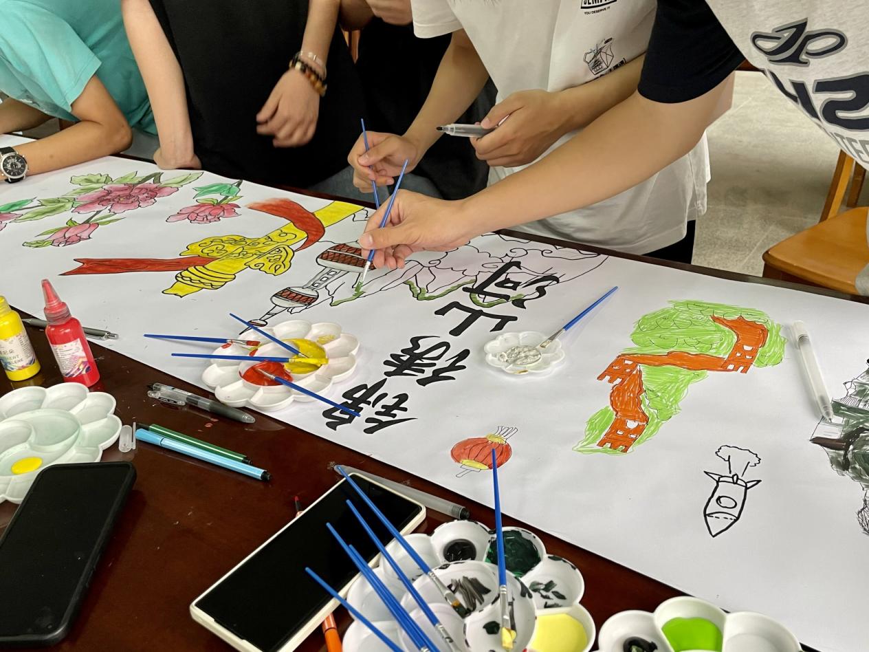 活动的开始,何丽玲老师介绍本次活动的流程与意义,鼓励大家自主发挥,尽情作画,将红色文化在这长卷中展现出来。作画期间,同学们用自己擅长的方式地将心中的红色文化画了出来,大家的画法各有千秋,有素描、水笔画、油画等等。虽画法不同,但展现的画作却是异曲同工,有“锦绣山河”图,“牡丹”图,“国泰民安”图,“红船精神”图等,述说了同学们对党和祖国的热爱。在长长的画卷上描绘地出一幅幅精美的画作,而一幅幅单独的画作也组成了一张时代新青年对红色文化对党对祖国的理解之画。之后,大家针对红色文化的传承和根植发表了自己的见解,助于同学们更好地了解红色文化,共同思索新时代的红色文化。