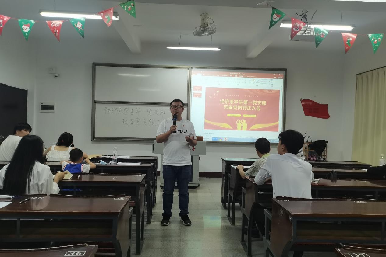 会议伊始,按照预备党员转正程序,预备党员依次向大会详细地汇报了在预备考察期内思想认识、理论学习、工作生活等方面的表现,剖析自身不足并表达对党的坚定信仰,并向大会提出转正申请。接着,入党介绍人就预备党员在预备期的表现及教育、考察情况进行评议,对预备党员予以肯定,同意其转为正式党员。随后,大会采取无记名投票的方式进行表决,大会一致同意吴锦云等三位同志按期转为中共正式党员。新转正党员逐一表态发言,表示未来将时刻以一名共产党员的标准,更加严格要求自己,不负党组织的信任。最后,由经济系员工第一党支部宣传委员杨越老师做总结讲话,表达对新转正党员的认可和期待。