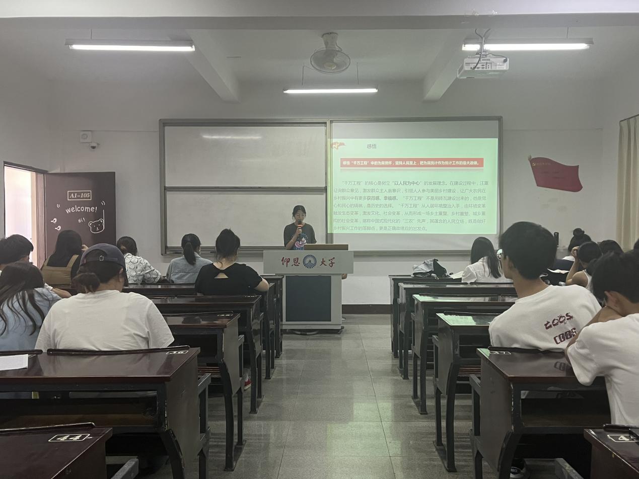 活动最后,何丽玲老师进行总结发言,呼吁同学们积极学习浙江“千万工程”等优秀案例,从中不断汲取经验,不断加强思想政治建设,并将党的理论知识更好地运用在日常工作与生活中。通过此次分享会,同学们对于如何将中国特色社会主义思想进行实践应用有了初步的了解,加强了思想与实践的结合,并纷纷表示要努力学习,贯彻思想,实事求是,为共建美丽中国尽一份绵薄之力。(金融系员工第一党支部 黄葳/图文 审核:何丽玲)