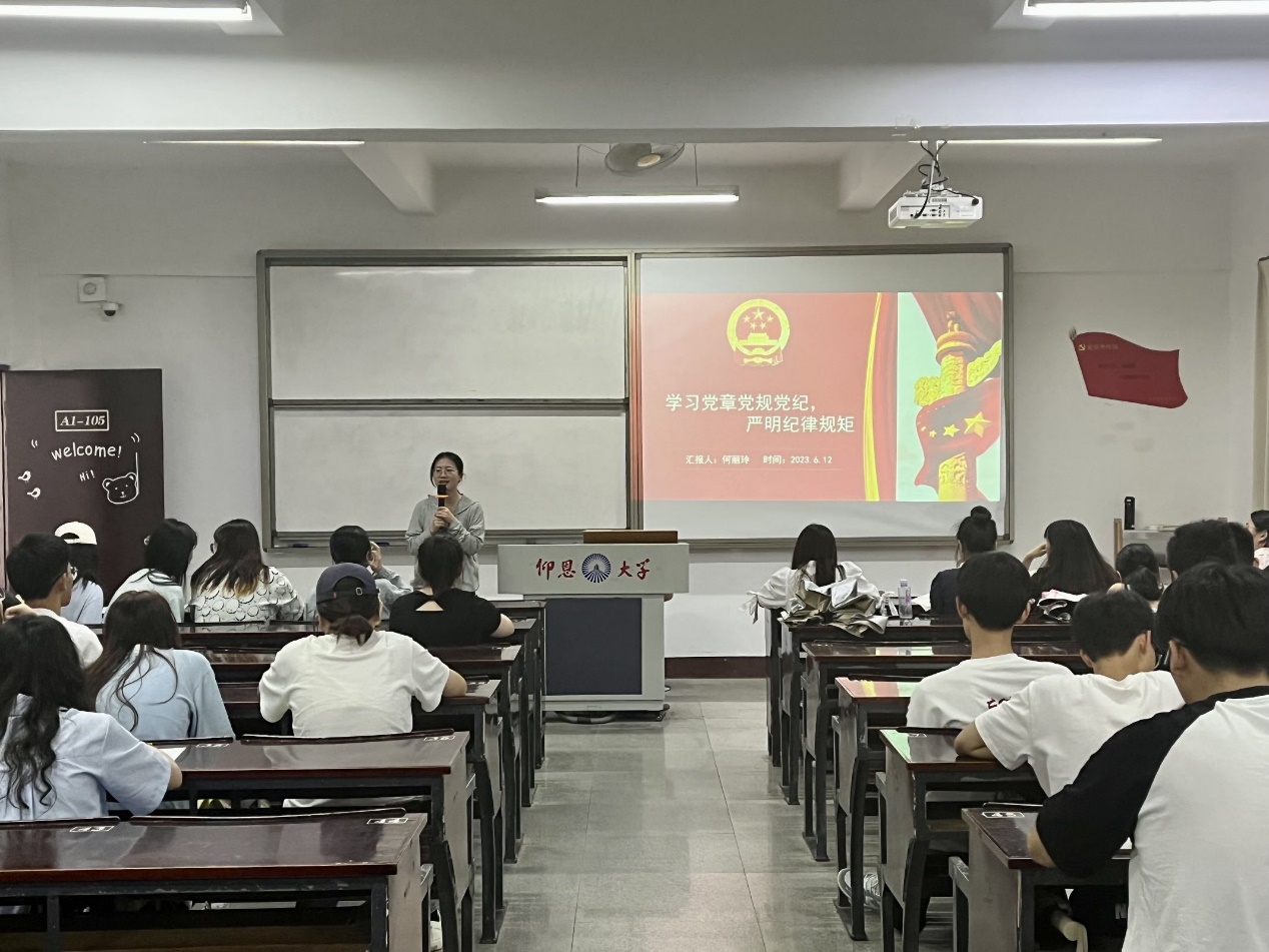 为学习领会党的二十大关于全面从严治党重大决策部署,深入落实习近平总书记关于严守党章党规党纪的重要论述和重要指示精神,2023年06月12日下午5:20,金融系员工第一党支部在仰恩楼A1-105组织开展党章党规党纪专题党课。此次党课围绕“学习党章党规党纪,严明纪律规矩”主题展开,由支部书记何丽玲老师主讲,支部全体党员及各班积极分子代表参加了此次党课学习。