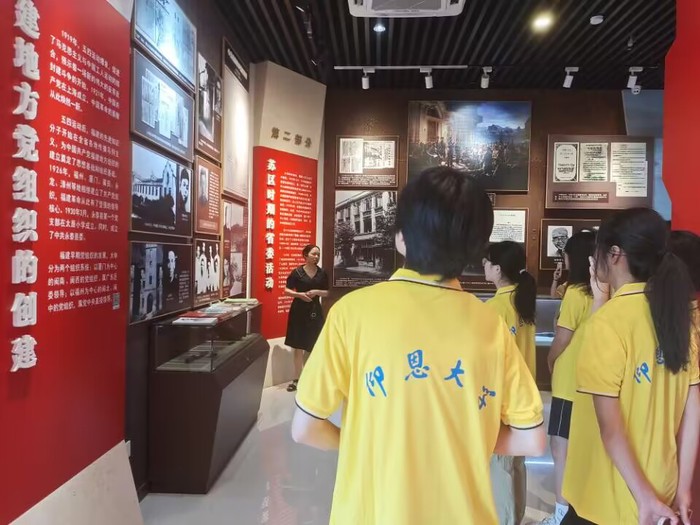 进入纪念馆,映入眼帘的是一座红色的革命纪念碑,上面镶嵌着中共党旗和毛泽东主席的塑像,庄严而庄重。纪念馆的展览馆内充满了历史氛围,进来后可以看到保存完好的旧时办公室、会议场所和其他重要场景。这些场景生动地重现了当时的政治氛围和中共福建省委党组织的工作环境。在展厅的最后一个区域,实践队看到了关于红军长征的展览。这里展示了长征开始前的准备工作,以及红军在长征中所面临的艰难困苦和英勇奋斗的场景。