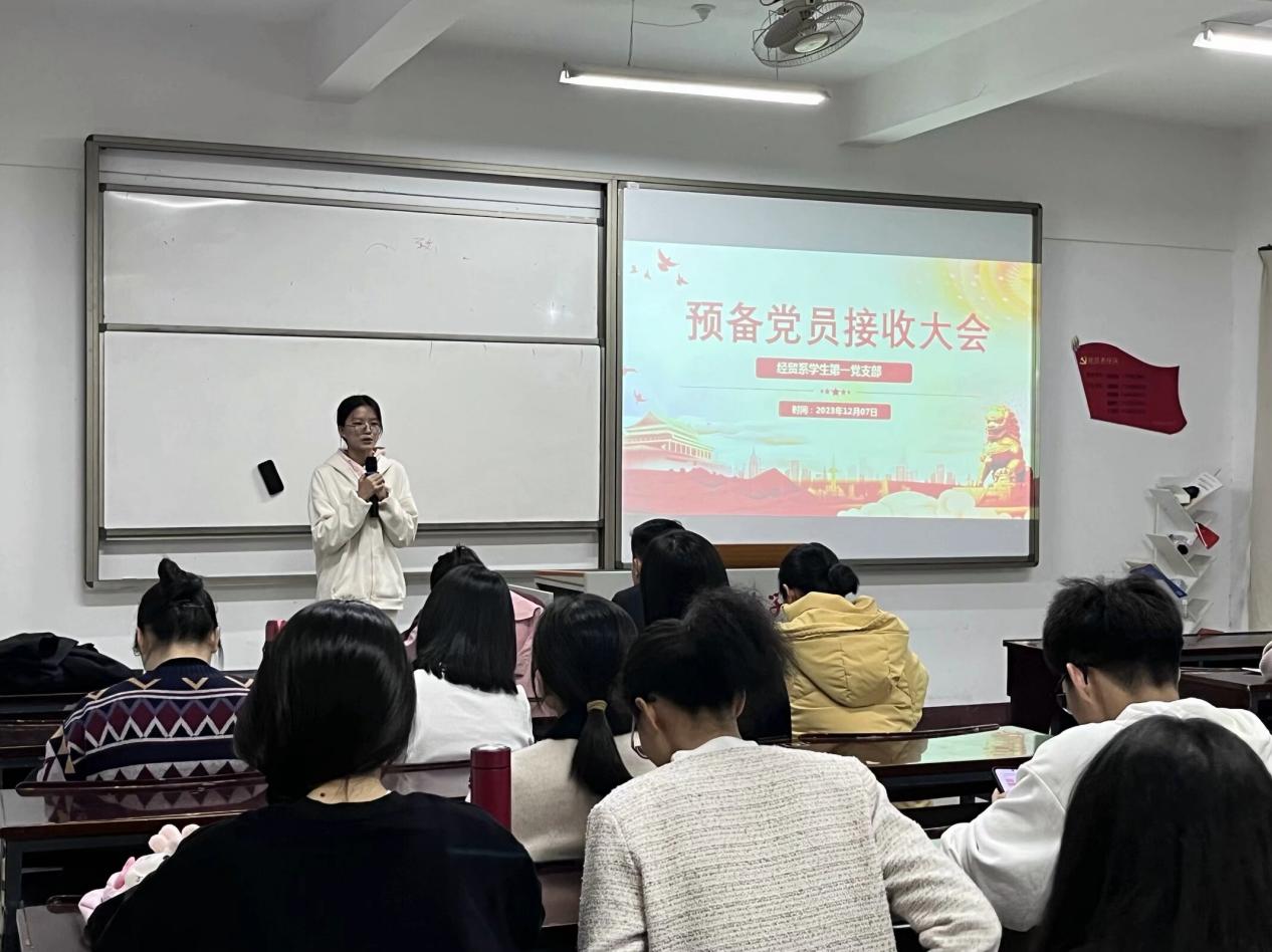 为壮大支部党员队伍,增强支部力量,为党组织汇入新鲜血液,经贸系员工第一党支部于2023年12月7日在仰恩楼A3-103召开了接收预备党员支部大会。参加此次会议的有经贸系员工第一党支部书记黄培真、组织委员林烽、宣传委员林丽华等全体党员及本次的五名发展对象。