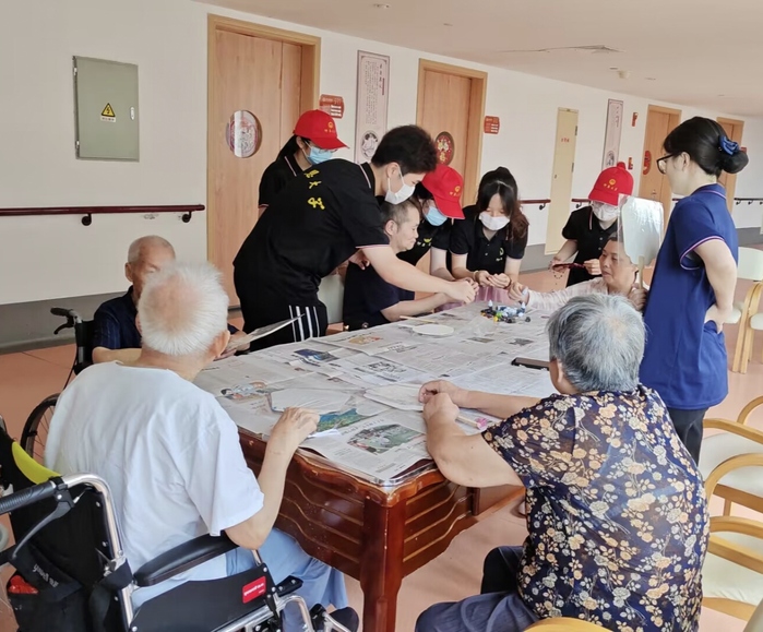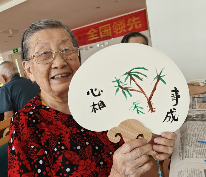千古文化留遗韵,一代文明展新风。7月17日上午9点,为了让老人们近距离感受传统文化的魅力,享受愉快的夏日时光。晨练结束后,实践队在福利中心颐居楼三楼大厅开展“千年风雅,非遗漆扇”活动,队员们陪同老人们制作手工漆扇和画扇。在漆扇制作环节,老人们挑选了自己喜欢的颜色,按照流程创作出独一无二的漆扇作品。而在画扇环节,老人们充分发挥想象力,用鲜艳的色彩在扇面上绘制牡丹图、勾勒山水景致、创作动物图案……每一件作品都凝聚了长者们的智慧和对生活的热爱。活动末尾,大家一起在大厅展示自己的成果,拍下了值得怀念的纪念照,老人们开心地将本次活动亲手制作的漆扇、画扇带回纪念。