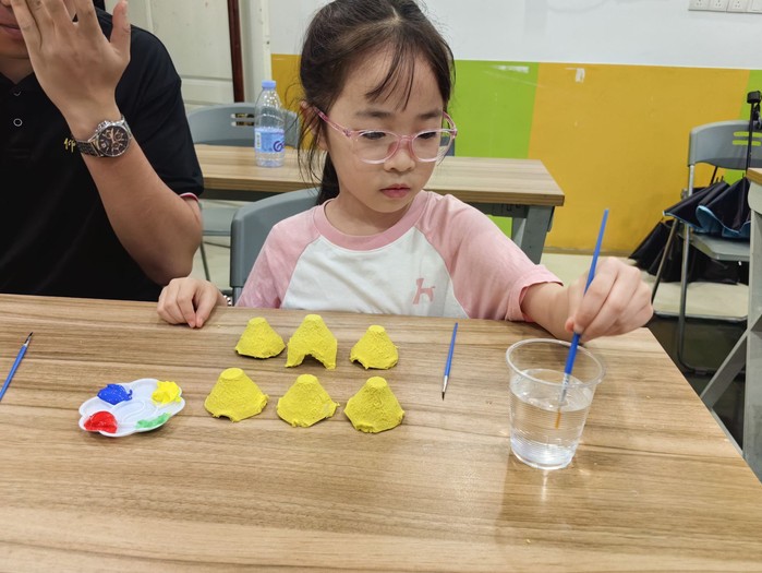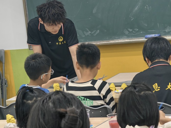 制作开始后,小朋友们认真制作,在蛋托上涂上自己喜欢的颜色,颜料晾干后,实践队成员们帮助小朋友们在蛋托上打孔,穿绳,挂铃铛,再将小朋友们的愿望写在书签上,清风拂过,铃声回荡,愿小朋友们的愿望随风飘向远方,梦想的光将照向期待的目光。