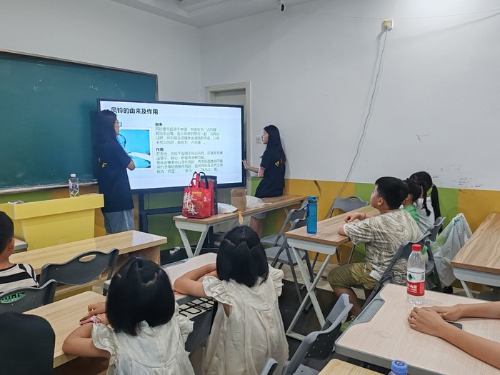 活动伊始,由实践队员通过课件和视频讲述了风铃的由来及其作用,帮助小朋友们更直观的了解中国传统文化——风铃。风铃常蕴含着对家人朋友的祝福,微风拂过风铃,清脆的回响饱含着数不尽的思念。实践队成员们简单介绍制作风铃需要的材料,并播放相关的教学视频,视频中缤纷绚丽的锦鲤风铃随风飘动,成功调动了小朋友们的热情和积极性,迫不及待地想要动手制作。
