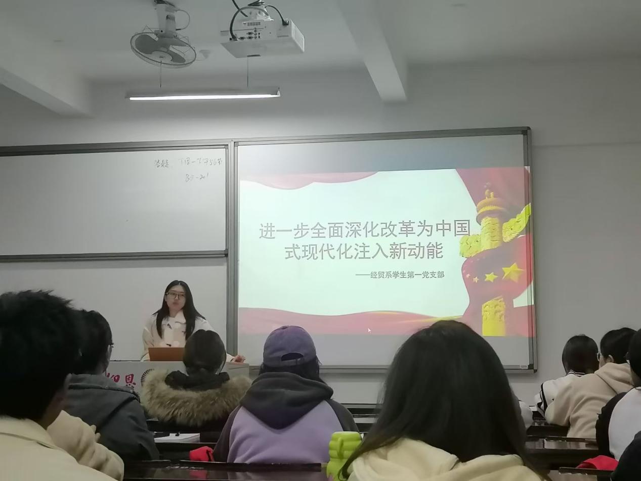 为深入学习贯彻党的二十届三中全会精神,全面把握和深刻领会习近平总书记关于全面深化改革的重要论述,经贸系员工第一党支部于12月26日下午,在仰恩楼A2-101组织开展书记讲党课,此次党课题为《进一步全面深化改革为中国式现代化注入新动能》。支部全体党员、积极分子参加本次活动。