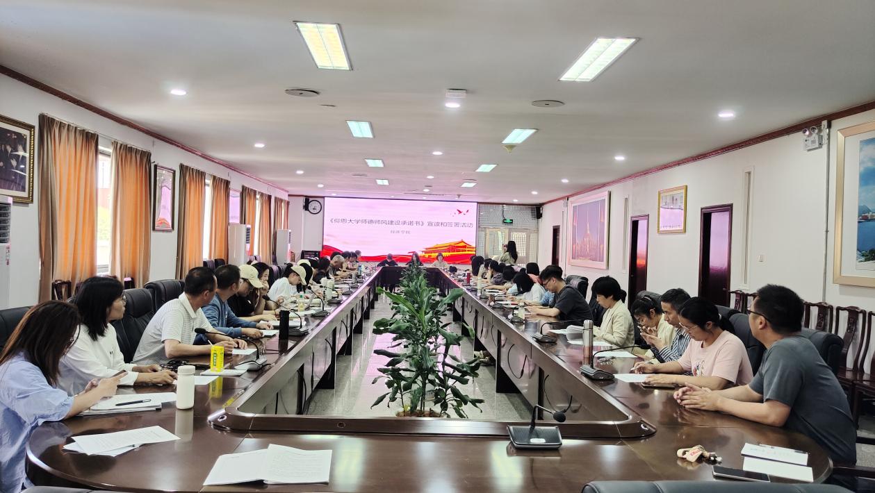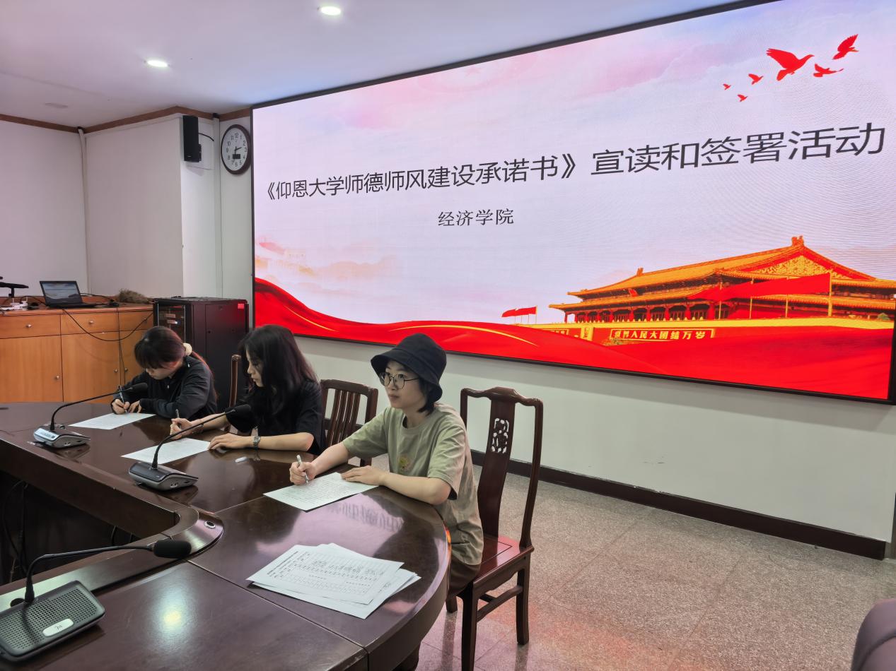 吴晓伟书记代表宣读《PA平台师德师风建设承诺书》,由财政学与金融学系、经济与贸易系、经济学系三位新入职教师作为代表上台签署承诺书,全体教职工签署承诺书。